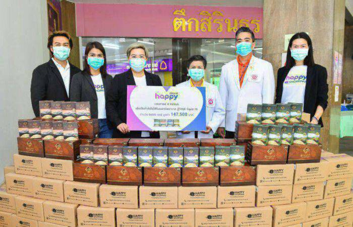 บริษัท แฮปปี้ กรุ๊ป จำกัด นำโดย อภิรวี พิชญเดชะ (ที่สามจากซ้าย) กรรมการผู้จัดการ และ นายธนพงษ์ ไชยลาโภ (ซ้าย) ผู้ช่วยกรรมการผู้จัดการ พร้อมทีมงาน happy shopping เข้ามอบผลิตภัณฑ์กาแฟ 4 Valleys จำนวน 5,000 ซอง มูลค่า 147,500 บาท ให้แก่ โรงพยาบาลราชวิถี เพื่อสนับสนุนและเป็นกำลังใจให้ทีมแพทย์พยาบาล และบุคลากรทางการแพทย์โรงพยาบาลราชวิถี โดยมี นางสาวอุมา วันดี (ที่สามจากขวา) รองผู้อำนวยการด้านอำนวยการ เป็นตัวแทนรับมอบ และ ณ ตึกสิรินธร โรงพยาบาลราชวิถี เมื่อเร็วๆนี้