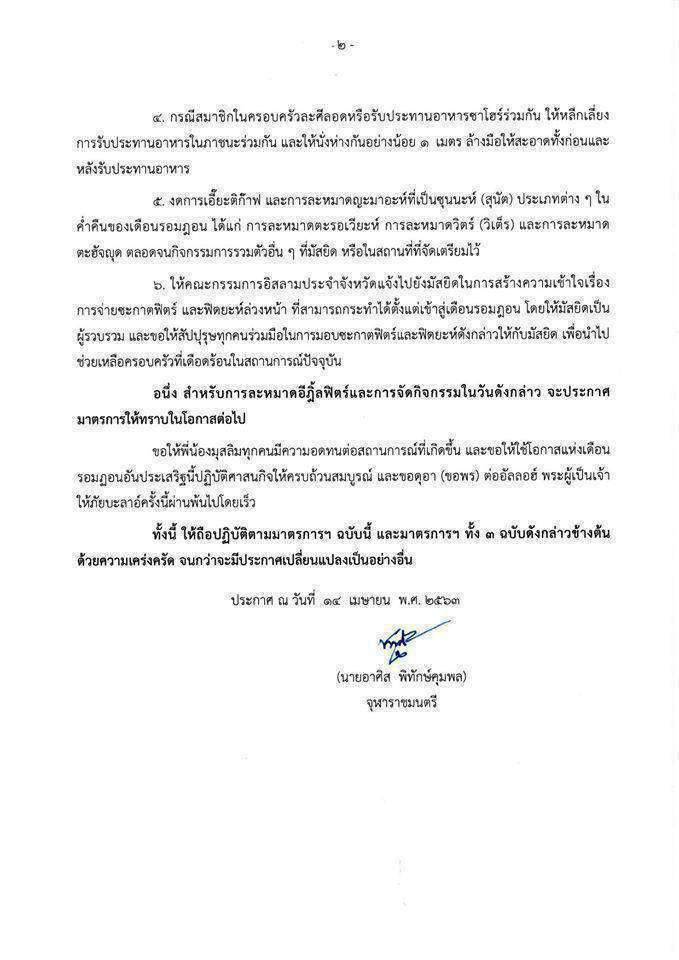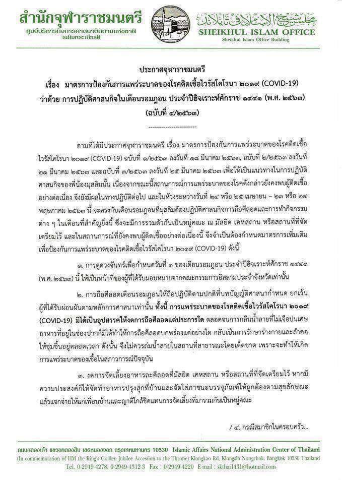 “การถือศีลอดเดือนรอมฎอนให้ถือปฏิบัติตามปกติที่บทบัญญัติศาสนากำหนด ยกเว้นผู้ที่ได้รับผ่อนผันตามหลักการศาสนาเท่านั้น ทั้งนี้ การแพร่ระบาดของไวรัสโคโรนา (โควิด-19 มิได้เป็นอุปสรรคให้งดการถือศีลอดแต่ประการใด” ประกาศระบุ