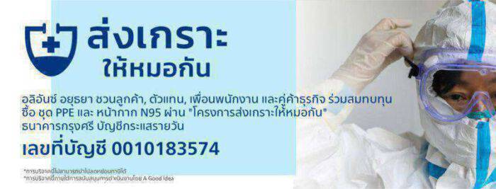 จากสถานการณ์การแพร่ระบาดของเชื้อไวรัสโควิด-19 ที่แพร่กระจายไปทั่วโลกรวมถึงในประเทศไทย ขณะนี้ทุกภาคส่วนต่างมีบทบาทสำคัญในการช่วยยับยั้งและป้องกันการแพร่ระบาด อลิอันซ์ อยุธยา เล็งเห็นถึงศักยภาพของเรา จากการเป็นบริษัทประกันภายใต้กลุ่มอลิอันซ์ที่มีเครือข่ายในกว่า 70 ประเทศทั่วโลก จึงได้ติดต่อไปยัง อลิอันซ์ ประเทศจีน เพื่อช่วยจัดหา ชุด PPE และ หน้ากาก N95 มาตรฐานการแพทย์ เพื่อมอบให้กับบุคคลากรทางการแพทย์ไทย ได้มีใช้เพื่อดูแลผู้ป่วยอย่างต่อเนื่อง