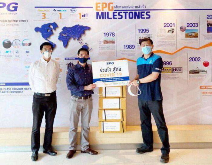 คุณธนาวัฒน์ วิทูรปกรณ์ (ขวา) กรรมการผู้จัดการ บริษัท อีสเทิร์น โพลีแพค จำกัด หรือ EPP ผู้ผลิตและจำหน่ายบรรจุภัณฑ์พลาสติก บริษัทย่อยของ บริษัท อีสเทิร์นโพลีเมอร์ กรุ๊ป จำกัด (มหาชน) หรือ EPG ร่วมมือกับโครงการพัฒนาและจัดหาอุปกรณ์ทางการแพทย์เป็นการเร่งด่วน เพื่อฝ่าวิกฤต Covid-19 ของมหาวิทยาลัยเทคโนโลยีพระจอมเกล้าธนบุรี โดยมอบแผ่นพลาสติกใส ผลิตจากพลาสติก PET ขนาด A4 หนา 0.3 มิลลิเมตร จำนวน 100,000 แผ่น ให้แก่ รศ.ดร.พงศ์พันธ์ แก้วตาทิพย์ (กลาง) อาจารย์ประจำภาควิชาวิศวกรรมเครื่องกล คณะวิศวกรรมศาสตร์มหาวิทยาลัยเทคโนโลยีพระจอมเกล้าธนบุรี และรองผู้อำนวยการ สำนักงานคณะกรรมการส่งเสริมวิทยาศาสตร์ วิจัยและนวัตกรรม กระทรวงการอุดมศึกษา วิทยาศาสตร์ วิจัย และนวัตกรรม เพื่อนำไปจัดทำกระจังป้องกันใบหน้า หรือ Face Shield ส่งต่อให้กับบุคลากรทางการแพทย์ทั่วประเทศ ณ สำนักงาน EPP ถ.บางนา-ตราด กรุงเทพฯ เมื่อเร็วๆ นี้