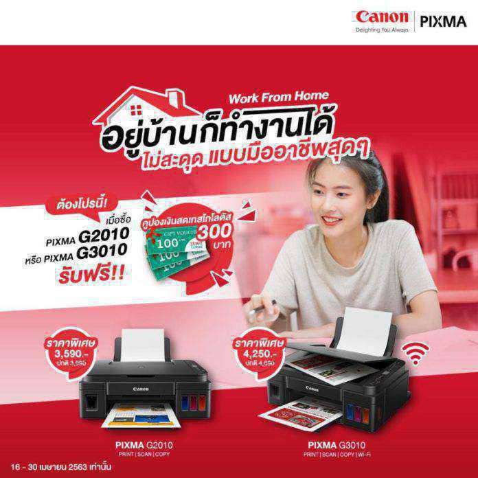 แคนนอน เอาใจคนทำงานอยู่บ้าน จัดแคมเปญ “อยู่บ้านก็ทำงานได้ ไม่สะดุด แบบมืออาชีพสุดๆ” กับโปรโมชัน Work from Home ซื้อพรินเตอร์อิงก์เจ็ทในราคาพิเศษ ได้แก่รุ่น PIXMA G2010 ราคา 3,590 บาท (ปกติ 3,990 บาท) และ PIXMA G 3010 ราคา 4,250 บาท (ปกติ 4,690 บาท) รับฟรี! คูปองเงินสดเทสโก้โลตัส มูลค่า 300 บาท จนถึงวันที่ 30 เมษายน 2563 นี้ เพียงลงทะเบียนรับคูปองผ่านทาง Line @PIXMATHAILAND หรือผ่านลิงก์ https://bit.ly/2UBhDtL พร้อมแนบหลักฐานการซื้อสินค้าให้ครบถ้วน แล้วรอรับคูปองได้ภายใน 3 วันทำการ