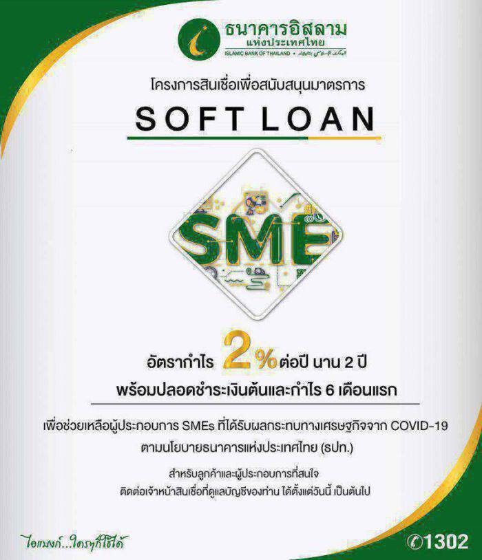 ธนาคารอิสลามแห่งประเทศไทย (ไอแบงก์) ออกสินเชื่อสนับสนุนมาตรการ Soft Loan อัตรากำไรต่ำเพียง 2% ต่อปี นาน 2 ปี พร้อมปลอดชำระเงินต้นและกำไร 6 เดือนแรก เพื่อช่วยเหลือผู้ประกอบการ SMEs ที่ได้รับผลกระทบทางเศรษฐกิจจาก COVID-19 ตามนโยบายธนาคารแห่งประเทศไทย (ธปท.)