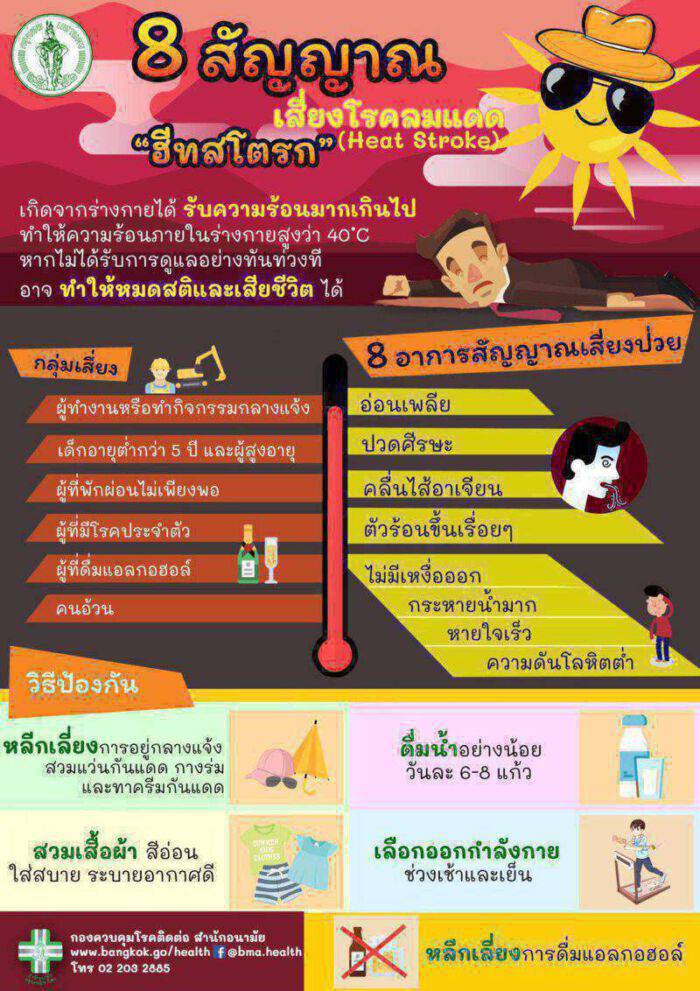 นางศิลปสวย ระวีแสงสูรย์ ปลัดกรุงเทพมหานคร กล่าวกรณีกระทรวงสาธารณสุข (สธ.) เตือนสภาพอากาศร้อนจัด ขอให้ประชาชนระวังการเจ็บป่วยที่เกิดขึ้น ได้แก่ เพลียแดด โรคลมร้อน หรือฮีตสโตรก (Heat Stroke) ว่า กรุงเทพมหานคร โดยสำนักอนามัย ได้ทำหนังสือแจ้งเตือนไปยังส่วนราชการที่เกี่ยวข้อง ได้แก่ ศูนย์บริการสาธารณสุข กทม.กองสุขาภิบาลอาหาร สำนักงานเขต สำนักพัฒนาสังคม สำนักการศึกษา และสำนักสิ่งแวดล้อม เพื่อประชาสัมพันธ์ส่งเสริมความรู้ รวมถึงให้คำแนะนำในการป้องกันโรคและภัยที่เกิดขึ้นในช่วงฤดูร้อน สำหรับประชาชน โดยเฉพาะใน 6 กลุ่มเสี่ยง ได้แก่ ผู้ที่ทำงานหรือกิจกรรมกลางแจ้ง เด็กอายุต่ำกว่า 5 ปี ผู้สูงอายุ ผู้ที่มีโรคประจำตัว ผู้ที่มีน้ำหนักตัวมากกว่า 100 กิโลกรัม ผู้ที่พักผ่อนไม่เพียงพอ และผู้ที่ดื่มเครื่องดื่มแอลกอฮอล์ในปริมาณมาก ขอเน้นย้ำให้หลีกเลี่ยงการอยู่กลางแดดที่ร้อนจัด ควรดื่มน้ำเปล่าให้มาก ๆ ตลอดทั้งวัน โดยไม่ต้องรอให้กระหายน้ำ สวมเสื้อผ้าที่ระบายความร้อนได้ดี โปร่งสบายไม่รัดแน่นจนเกินไป หลีกเลี่ยงการดื่มเครื่องดื่มแอลกอฮอล์ทุกชนิด ไม่ปล่อยให้ผู้สูงอายุหรือผู้ป่วยติดเตียงอยู่ในบ้านที่เป็นห้องกระจกปิดไว้เพียงลำพัง นอกจากนั้น ยังได้ให้คำแนะนำเกี่ยวกับวิธีการปฐมพยาบาลเบื้องต้น ได้แก่ การนำผู้มีอาการเข้าพักในร่ม นอนราบยกเท้าสูงทั้งสองข้าง ถอดเสื้อผ้าชั้นนอกออก ใช้ผ้าชุบน้ำเช็ดตัว เพื่อลดอุณหภูมิร่างกายให้ต่ำลงโดยเร็วที่สุด ใช้ผ้าชุบน้ำเย็นหรือน้ำแข็งประคบตามซอกคอ รักแร้ ขาหนีบ ไม่ควรใช้ผ้าเปียกคลุมตัวเพราะจะขัดขวางการระเหยของน้ำออกจากร่างกาย และรีบนำส่งโรงพยาบาลที่ใกล้ที่สุด