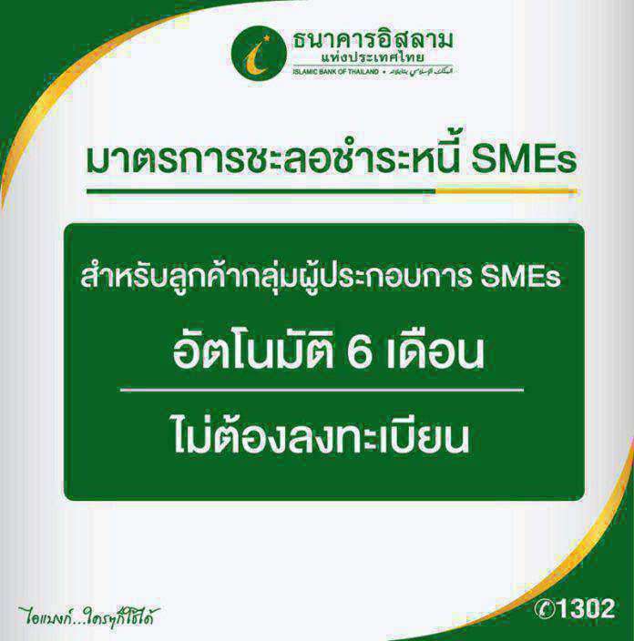 ธนาคารอิสลามแห่งประเทศไทย (ไอแบงก์) ขานรับนโยบายธนาคารแห่งประเทศไทย เพื่อช่วยเหลือลูกค้าผู้ประกอบการ SMEs และลดปัญหาการขาดสภาพคล่องในการดำเนินธุรกิจให้สามารถดำเนินกิจการต่อโดยไม่กระทบต่อการจ้างงาน ด้วยการชะลอการชำระเงินต้นและกำไรอัตโนมัติ เป็นระยะเวลา 6 เดือน