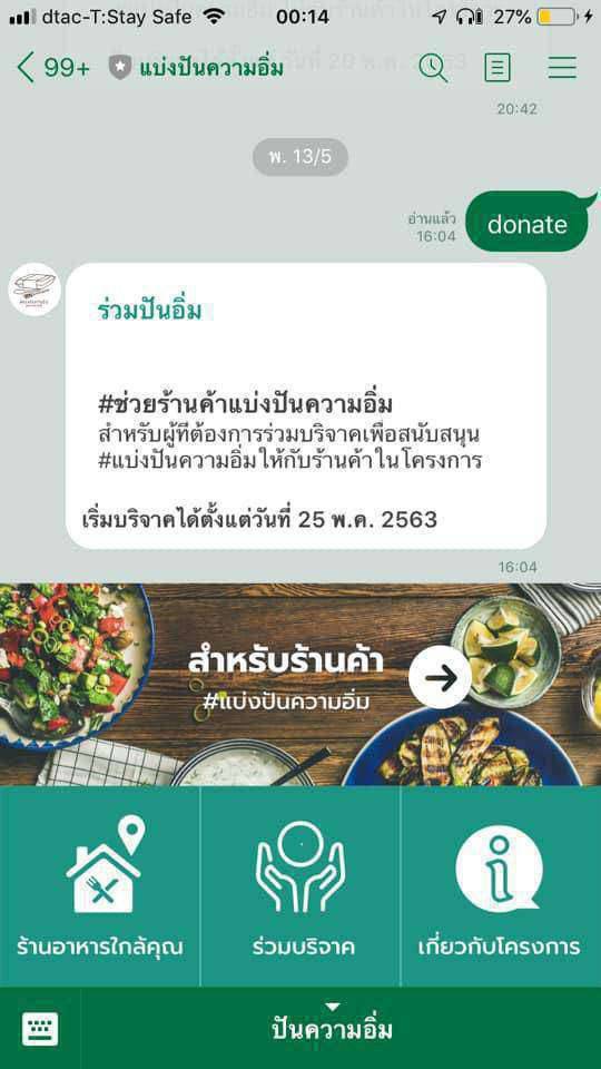 ปัจจุบันโครงการแบ่งปันความอิ่ม Pay it forward Thailand เติบโตขึ้นอย่างอบอุ่น จากการช่วยเหลือของผู้คนรอบข้าง คนรู้จักใกล้ชิด ขยายสู่การช่วยเหลือที่กว้างขึ้นอย่างรวดเร็ว ล่าสุดโครงการได้มีการพัฒนารูปแบบการเข้าถึงความช่วยเหลือ ผ่าน Application ชื่อ LINE@payitforward (แบ่งปันความอิ่ม) เพื่อให้ผู้ที่ต้องการช่วยเหลือเข้าถึงร้านค้า และชุมชนได้ง่ายและสะดวกมากขึ้น โดยผู้ที่อยากช่วยเหลือสามารถร่วมแบ่งปันได้ทันทีในเมนูร่วมแบ่งปัน หากเป็นร้านค้าก็สามารถร่วมโครงการได้โดยลงทะเบียนเป็นร้านปันอิ่ม ซึ่งระบบออนไลน์นี้ได้รับการสนับสนุนจากบริษัท ไอคอน เฟรมเวิร์ค จำกัด ในการช่วยกันพัฒนาและบริหารจัดการระบบทั้งหมดให้มีประสิทธิภาพ มีความโปร่งใส และสามารถคัดกรองร้านค้าที่เชื่อถือได้ ที่จะมั่นใจได้ว่าเงินทุกบาทจากผู้ร่วมบริจาคได้ช่วยเหลือถึง ผู้เดือดร้อนอย่างแท้จริง