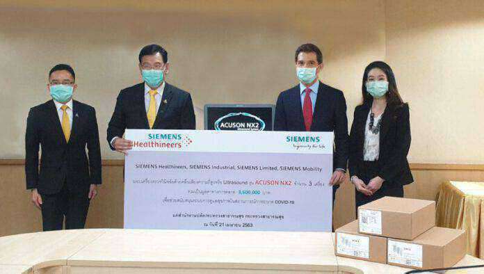 25 พฤษภาคม 2563 – กลุ่มบริษัท ซีเมนส์ ในประเทศไทย เดินหน้าสนับสนุนบุคลากรทางการแพทย์ ในการต่อสู้กับการแพร่ระบาดของเชื้อไวรัส โคโรนาสายพันธุ์ใหม่ SARS-CoV-2 (COVID-19) ด้วยการบริจาคเครื่องอัลตราซาวด์ ACUSON NX2™ของซีเมนส์ เฮลทธิเนียร์ส มูลค่ากว่า 3.6 ล้านบาท แก่สำนักงานปลัดกระทรวง กระทรวงสาธารณสุข