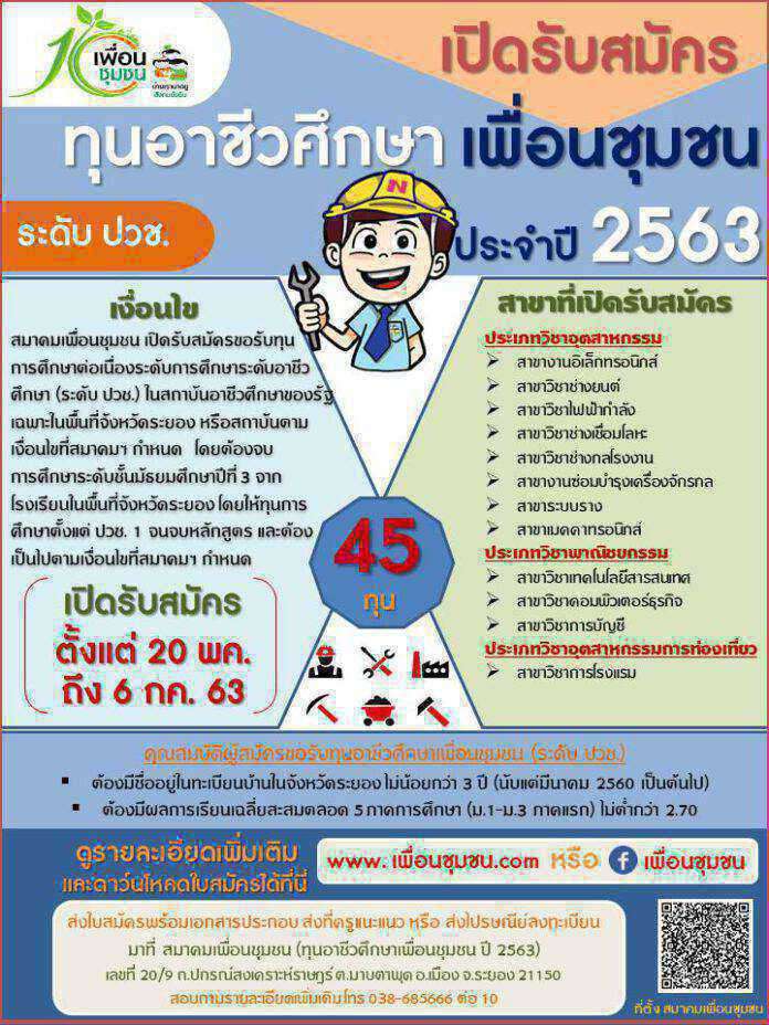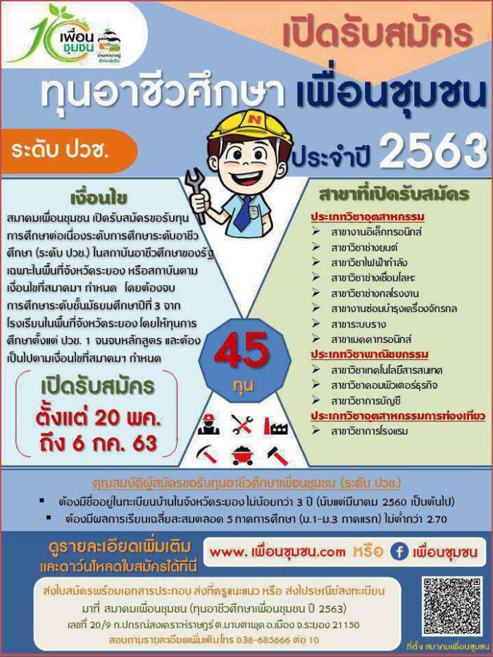 สมาคมเพื่อนชุมชน เปิดรับสมัครขอรับทุนการศึกษาต่อเนื่องในหลักสูตรอาชีวศึกษา ระดับประกาศนียบัตรวิชาชีพ (ปวช.) ในสถาบันการศึกษาของรัฐ ในโครงการ “ทุนอาชีวศึกษาเพื่อนชุมชน ประจำปี 2563” เพื่อเพิ่มโอกาสทางการศึกษาให้แก่เยาวชนจังหวัดระยองได้ศึกษาต่อในสายอาชีพ ตลอดจนรองรับความต้องการตลาดแรงงานในเขตพื้นที่อีอีซีในอนาคต โดยผู้สมัครจะต้องจบการศึกษาระดับมัธยมศึกษาปีที่ 3 จากโรงเรียนในจังหวัดระยอง และมีผลการเรียนเฉลี่ยสะสม ไม่ต่ำกว่า 2.70 เปิดรับสมัคร ตั้งแต่วันนี้ – 6 กรกฎาคม 2563 นี้