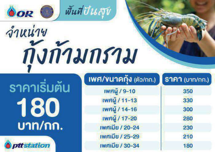 นายบุญมา พนธนกรกุล รองกรรมการผู้จัดการใหญ่ธุรกิจค้าปลีกน้ำมัน บริษัท ปตท. น้ำมันและการค้าปลีก จำกัด (มหาชน) (โออาร์) และ นายมีศักดิ์ ภักดีคง อธิบดีกรมประมง ร่วมประชาสัมพันธ์ การเปิด “พื้นที่ปันสุข” ในสถานีบริการน้ำมัน พีทีที สเตชั่น ตามโครงการรวมพลังสร้างรอยยิ้มเกษตรกรไทย โดยเปิดพื้นที่ให้กลุ่มเกษตรกรผู้เลี้ยงกุ้งก้ามกรามจากจังหวัดสุพรรณบุรี นครปฐม และราชบุรี นำกุ้งก้ามกราม (สด) และสินค้าสัตว์น้ำแปรรูป มาจำหน่ายในราคาพิเศษที่สถานีบริการน้ำมัน พีทีที สเตชั่น 4 แห่ง ได้แก่ สถานีบริการน้ำมัน พีทีที สเตชั่น สาขาสวัสดิการ ร.1 รอ. สถานีบริการน้ำมัน พีทีที สเตชั่น สาขาประชาอุทิศ-ลาดพร้าว สถานีบริการน้ำมัน พีทีที สเคชั่น สาขาเทพรักษ์ และสถานีบริการน้ำมัน พีทีที สเตชั่น สาขาวงแหวนกาญจนาภิเษก – ตลิ่งชัน ในวันที่ 7 และ 14 มิถุนายน 2563 ตั้งแต่เวลา 09:00 น. เป็นต้นไป จนกว่าของจะหมด โดยสถานีบริการแต่ละแห่งจะมีกุ้งก้ามกราม (สด) มาจำหน่าย ประมาณ 500 – 1,000 กิโลกรัม จำหน่ายในราคาเริ่มต้นที่ 180 – 350 บาท ต่อกิโลกรัม (ราคาตามขนาด) และขอสงวนสิทธิในการจำหน่ายกุ้งก้ามกรามเพศผู้ขนาด 9-10 ตัวต่อกิโลกรัม และ 11-13 ตัวต่อกิโลกรัม จำกัดให้ซื้อได้ไม่เกิน 3 กิโลกรัมต่อคน กุ้งก้ามกรามเพศผู้ขนาด 14-16 ตัวต่อกิโลกรัม และ 17-20 ตัวต่อกิโลกรัม จำกัดให้ซื้อได้ไม่เกิน 5 กิโลกรัมต่อคน และกุ้งก้ามกรามเพศเมียทุกขนาด จำกัดให้ซื้อได้ไม่เกิด 10 กิโลกรัมต่อคน ผู้สนใจสามารถสอบถามรายละเอียดเพิ่มเติมได้ที่ กรมประมง โทร 02-562-0600-15 หรือสอบถามรายละเอียดสถานีบริการน้ำมัน พีทีที สเตชั่น ที่มีกุ้งก้ามกรามจำหน่ายได้ที่โทร. 1365 Contact Center
