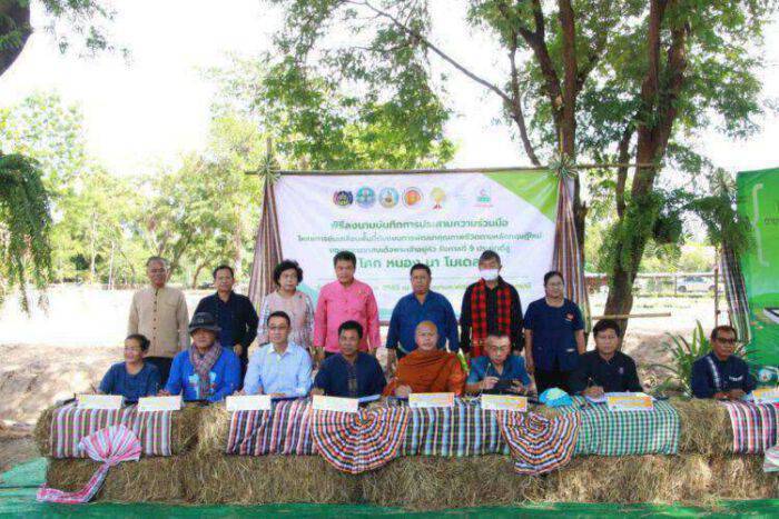 ทั้งนี้ มีการลงนามความร่วมมือ (MOU) ระหว่าง พระครูสุขุมวรรโณภาส เจ้าอาวาสวัดวังอ้อ เจ้าคณะตำบลหัวดอน ในฐานะผอ.ศูนย์พุทธธรรมสมเด็จพระมหาธีราจารย์ จ.อุบลราชธานี นายเกริกชัย ผ่องแผ้ว ปลัดจ.อุบลราชธานี นายพันมหา ทองบ่อ ผอ.พัฒนาที่ดินจ.อุบลราชธานี นางราตรี สะดีวงศ์ รองผอ.วิทยาเกษตรและเทคโนโลยีอุบลราชธานี นายสมชาติ พงคพนาไกร กรรมการผู้จัดการบริษัท คูโบต้าเจริญชัย นายศุกดิ์ชัย บุญญะบาล ประธานเครือข่ายกสิกรรมธรรมชาติอุบลราชธานี เพื่อขับเคลื่อนโครงการฯร่วมกันด้วย