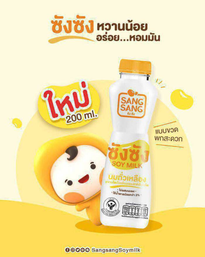 แบรนด์น้องใหม่ “ซังซัง” ขอแนะนำ “ซัง ซัง โฉมใหม่แบบขวด” นมถั่วเหลืองคั้นสด รสชาติอร่อย หอมมัน และมีน้ำตาลน้อยกว่า 2% ผลิตจากเมล็ดถั่วเหลืองจากประเทศแคนาดา แคลอรี่ต่ำ ไม่ผสมนมผง ไม่มีวัตถุกันเสีย เป็นแหล่งโปรตีนสำหรับคนรักสุขภาพอย่างแท้จริง มาในรูปแบบบรรจุขวดพร้อมดื่ม ขนาด 200 ml ดีไซน์น่ารัก สดใส สามารถพกพาไปดื่มเติมสุขภาพที่ดีได้ทุกที่ทุกเวลา สามารถหาซื้อผลิตภัณฑ์นมถั่วเหลืองซังซังได้ตามร้านค้าทั่วไป และในซูเปอร์มาร์เก็ตชั้นนำทั่วประเทศ