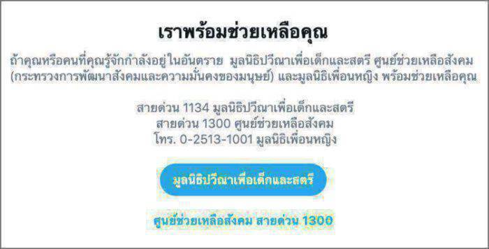 สืบเนื่องจากปัญหาเหตุการณ์ความรุนแรงทางเพศต่อสตรีและเด็กผู้หญิง (gender-based violence) ทั่วโลกที่เพิ่มสูงขึ้นในช่วงมาตรการล็อคดาวน์เพื่อป้องกันการแพร่ระบาดของไวรัสโควิด-19 ทวิตเตอร์จึงเปิดตัวฟีเจอร์บริการแจ้งเตือนรองรับ 7 ภาษารวมถึงภาษาไทย โดยเมื่อผู้ใช้ทวิตเตอร์ค้นหาคีย์เวิร์ดภาษาไทยที่เกี่ยวข้องกับความรุนแรงทางเพศ จะได้รับการแจ้งเตือนอัตโนมัติภาษาไทยเป็นเบอร์สายด่วนขององค์กรที่ช่วยเหลือผู้ได้รับผลกระทบจากความรุนแรงดังกล่าวในประเทศไทยและสามารถโทรติดต่อเพื่อขอความช่วยเหลือได้ทันที