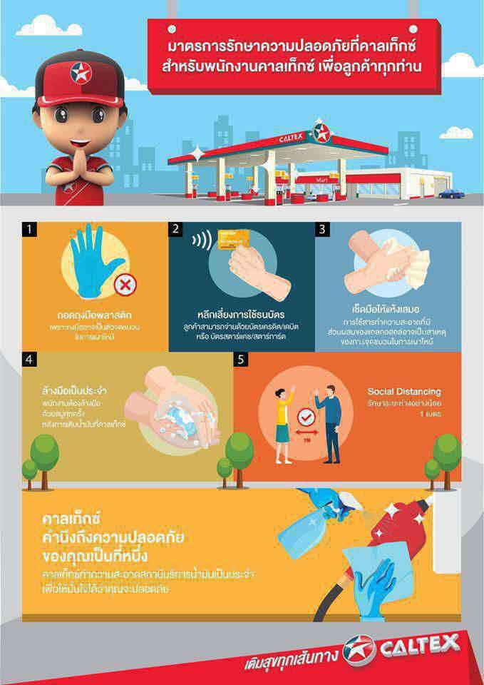 นอกจากนี้ บริษัทฯ ยังให้ความสำคัญกับมาตรการความปลอดภัยภายในสถานีบริการน้ำมันคาลเท็กซ์เป็นอย่างมาก มีการนำมาตรการด้านสุขอนามัยที่เข้มข้น มาใช้ในการดูแลบุคลากรหน้าลาน เช่น ให้มีการวัดอุณหภูมิร่างกายก่อนการเริ่มปฏิบัติหน้าที่ทุกครั้ง และให้สวมใส่หน้ากากอนามัยขณะปฏิบัติหน้าที่ ทำความสะอาดมือด้วยสบู่หรือแอลกอฮอล์เจลล้างมือ รวมไปถึงการเพิ่มความถี่ในการทำความสะอาดอุปกรณ์ต่าง ๆ ด้วยน้ำยาฆ่าเชื้อ เพื่อป้องกันและลดการแพร่ระบาดของโรคติดเชื้อไวรัสโคโรนา 2019