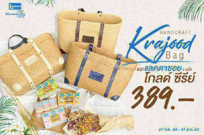 แลคตาซอย เอาใจผู้บริโภคที่ต้องการซื้อผลิตภัณฑ์ไปฝากคนที่รักและห่วงใย ให้ได้มีสุขภาพที่ดีไปด้วยกัน โดยจัดโปรโมชันพิเศษ สเปเชียลเซ็ท “แลคตาซอย รักษ์ไทย” ซีซัน2 สำหรับผู้ที่สั่งซื้อสินค้าผ่านช่องทางออนไลน์ โดยในเซ็ทประกอบด้วย นมถั่วเหลืองแลคตาซอย โกลด์ซีรีย์ บรรจุ 12 กล่อง 4 รสชาติเข้มข้น ได้แก่ คอลลาเจน ไฟเบอร์ ขนาด 180 ml. จำนวน 3 กล่อง ชาเขียวมัทฉะ ขนาด 180 ml. จำนวน 3 กล่อง เอ็กซ์ตร้าช็อกโก ขนาด 180 ml. จำนวน 3 กล่อง และ ไฮแคลเซียม ผสมโสมสกัด ขนาด 180 ml. จำนวน 3 กล่อง มาพร้อมกับกระเป๋ากระจูด Handcraft สุดน่ารัก ขนาด 11”x17”x15” มีให้เลือก 3 สี ได้แก่ ครีม นวลจันทร์ , น้ำเงินไพลิน และน้ำตาลสัมฤทธ์ สร้างสรรค์ด้วยภูมิปัญญาท้องถิ่นจากกลุ่มวิสาหกิจชุมชนหัตกรรมกระจูดวรรณี จังหวัดพัทลุง
