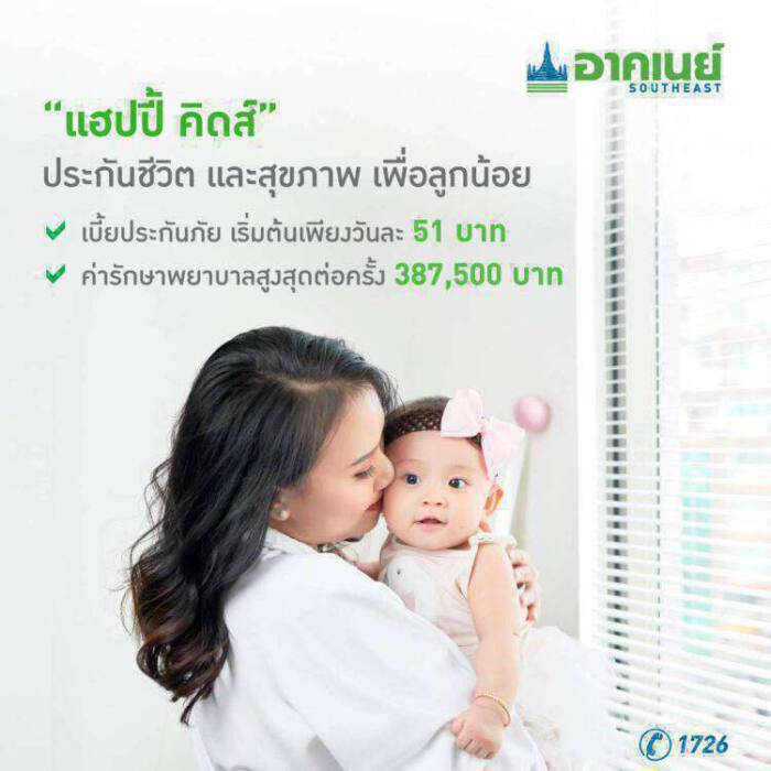 อาคเนย์ กลุ่มธุรกิจประกันและการเงิน ส่งแผนประกันชีวิตและสุขภาพเด็ก “แฮปปี้ คิดส์” เพื่อเติมเต็มความสุขของพ่อแม่ และลูกน้อย เบี้ยประกันเริ่มต้นวันละ 51 บาท มีให้เลือกถึง 2 แผนทั้งเพศหญิงและชาย คุ้มครองครอบคลุมทั้งชีวิตและค่ารักษาพยาบาลกว่า 380,000 บาท ต่อครั้งการรักษา ไม่จำกัดจำนวนครั้งต่อปี