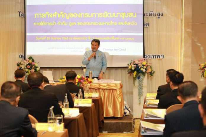 นายสุทธิพงษ์ จุลเจริญ อธิบดีกรมการพัฒนาชุม กล่าวในการบรรยายว่า กรมการพัฒนาชุมชน มีภารกิจที่เกี่ยวข้องกับความเป็นอยู่ของประชาชน ทั้งการส่งเสริมอาชีพ ความมั่นคงทางเศรษฐกิจ โดยแยกเป็น 2 ขา คือ การทำมาหากิน ไม่ว่าจะเป็นการรวมกลุ่มผลิต OTOP สัมมาชีพชุมชน โครงการพัฒนาพื้นที่ต้นแบบการพัฒนาคุณภาพชีวิตตามหลักทฤษฎีใหม่ ประยุกต์สู่ โคก หนอง นา โมเดล รวมไปถึงโครงการชุมชนท่องเที่ยว OTOP นวัตวิถี อีกขาหนึ่ง คือ ทุนชุมชน ไม่ว่าจะเป็นกองทุนแก้ไขปัญหาความยากจน กลุ่มออมทรัพย์เพื่อการผลิต กองทุนพัฒนาบทบาทสตรีที่มีสมาชิกกว่า 14 ล้านคน และบริษัท ประชารัฐรักสามััคคี จำกัด โดยทั้ง 2 ขานี้ มีมวลชนที่รองรับ คือ ผู้นำอาสาพัฒนาชุมชน ผู้นำสตรี ภาคีเครือข่ายที่เป็นปราชญ์ชาวบ้าน OTOP Trader งานของกรมการพัฒนาชุมชน เป็นงานสำคัญ โดยมีวรรคทอง 2 วรรค วรรคแรกของผู้ใหญ่เก่า ๆ ในกระทรวงมหาดไทยว่า “งานของกรมการพัฒนาชุมชน ตรงกับวิสัยทัศน์ของกระทรวงมหาดไทยที่ว่า บำบัดทุกข์ บำรุงสุข มากกว่าทุกกรม” และของท่านพลเอกอนุพงษ์ เผ่าจินดา รัฐมนตรีว่าการกระทรวงมหาดไทยว่า “ข้าราชการกรมการพัฒนาชุมชนเป็นข้าราชการที่คุยกับชาวบ้านรู้เรื่องมากกว่าทุกกระทรวงทบวงกรม มีนัยนะชาวบ้านให้ความเชื่อถือข้าราชการกรมการพัฒนาชุมชนงานของเราเป็นงานที่ได้บุญ ทั้งบุญกุศล แล้วก็บุญคุณ จึงขอให้ท่านผู้ว่าราชการจังหวัดได้ช่วยดูแลนำการขับเคลื่อนด้วย และในปีนี้ ท่านผู้ว่าราชการจังหวัดจะได้ใช้ประโยชน์ จากการจัดเก็บข้อมูลจปฐ. ที่ดีมากกว่าเก่า สามารถใช้เป็นลายแทงในการที่จะลงไปช่วยเหลือพี่น้องประชาชนได้อย่างเป็นรูปธรรม สะดวกง่ายกว่าในอดีต เพราะว่าปีนี้จะเป็นระบบดิจิตอลในการจัดเก็บ เราใช้คำว่า Smart survey ในการประมวล มีการอัพเดท แล้วก็มีการรวบรวมส่งข้อมูลให้ท่านผู้ว่าราชการจังหวัดต่อไป ในส่วนของภารกิจสำคัญของกรมการพัฒนาชุมชน ก็ยังมีอีกเยอะ ซึ่งถือว่ามีศักยภาพที่จะส่งเสริมบทบาทภารกิจของผู้ว่าราชการจังหวัดได้