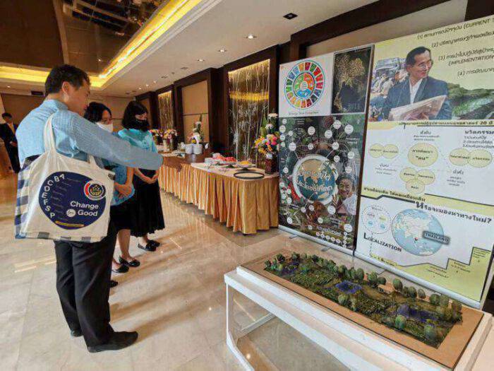 สำหรับโครงการพัฒนาพื้นที่ต้นแบบการพัฒนาคุณภาพชีวิต ตามหลักทฤษฎีใหม่ ประยุกต์สู่ โคก หนอง นา โมเดล กรมการพัฒนาชุมชน ได้ดำเนินงานมาตั้งแต่ปี 2563 ซึ่งกรมฯ เป็นเจ้าภาพหลักในเรื่องปรัชญาของเศรษฐกิจพอเพียงอยู่แล้ว ทำมาแล้วเกินกว่า 15 ปี มีหมู่บ้านต้นแบบ มีผู้นำที่เป็นแกนหลัก แต่ยังไม่ติดตลาด จึงได้น้อมนำหลักทฤษฎีใหม่กว่า 40 ทฤษฎี ของพระบาทสมเด็จพระบรมชนกาธิเบศร มหาภูมิพลอดุลยเดชมหาราช บรมนาถบพิตร รัชกาลที่ 9 มาประยุกต์สู่ “โคก หนอง นา โมเดล” เพื่อยกระดับพัฒนาคุณภาพชีวิตที่ดีของประชาชน ด้วยความเชื่อมั่นว่า หลักทฤษฎีใหม่และหลักปรัชญาของเศรษฐกิจพอเพียงเป็นหนทางที่จะทำให้ประเทศชาติรอดพ้นวิกฤตและเกิดการพัฒนาที่ยั่งยืน โดยพัฒนาผู้นำต้นแบบแล้ว 1,500 คน และพัฒนาพื้นที่ของศูนย์ศึกษาและพัฒนาชุมชน ทั้ง 11 แห่ง ให้เป็นศูนย์เรียนรู้ ที่ตั้งอยู่ทั่วทุกภูมิภาคของประเทศ และขณะนี้กรมฯ ได้รับอนุมัติเพื่อใช้เงินกู้เพื่อกระตุ้นเศรษฐ กิจภายหลังวิกฤติโควิดจำนวน 4,700 กว่าล้านบาท เพื่อดำเนินโครงการในพื้นที่ 25,179 แปลง ใน 73 จังหวัด และกำลังจะขอในระยะทั้ง 2 อีกประมาณ 14,000 กว่าครัวเรือน โดยประยุกต์ใช้หลักทฤษฎีใหม่ประมาณ 15 ทฤษฎี เช่น ใช้อธรรมปราบอธรรม การปลูกป่า 3 อย่างประโยชน์ 4 อย่าง หลุมขนมครก การห่มดิน เป็นต้น