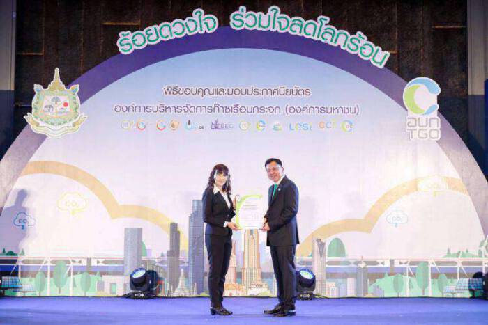 นางณัฎฐ์วรีย์ อินทรโชติ (ซ้าย) ผู้จัดการ-ความปลอดภัย อาชีวอนามัยและสภาพแวดล้อม บริษัท เหล็กสยามยามาโตะ จำกัด หรือ SYS ผู้ผลิตเหล็กเอชบีม ไวด์แฟลงก์ มากกว่า 25 ปี เข้ารับมอบประกาศนียบัตรรับรองการปลดปล่อยก๊าซเรือนกระจก หรือคาร์บอนฟุตพริ้นต์ขององค์กร (CFO) ของโรงงาน SYS 2 ที่นิคมอุตสาหกรรมดับบลิวเอชเอ ตะวันออก (มาบตาพุด) จ.ระยอง จากนายจตุพร บุรุษพัฒน์ (ขวา) ปลัดกระทรวงทรัพยากรธรรมชาติและสิ่งแวดล้อม ในงาน “ร้อยดวงใจ ร่วมใจลดโลกร้อน” ประจำปี 2563 ณ โรงแรมเดอะเบอร์เคลีย์ ประตูน้ำ กรุงเทพฯ เมื่อไม่นานมานี้