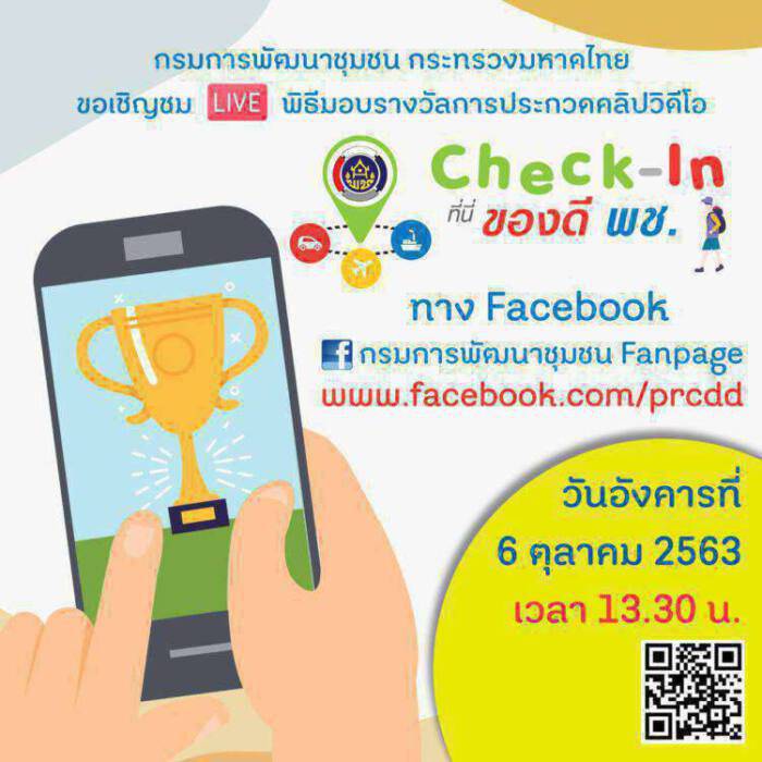 สำหรับ กิจกรรมประกวดคลิปวีดิโอ หัวข้อ “Check-in ที่นี่ของดี พช.” แบ่งเป็น 3 ประเภท ได้แก่ ประเภทนักเรียน นักศึกษา ประเภทประชาชนทั่วไป และประเภทบุคคลากรกรมการพัฒนาชุมชน  โดยได้เชิญกรรมการจากภายนอกร่วมเป็นกรรมการคัดเลือกและตัดสิน  มีผลงานส่งเข้าร่วมประกวดรวม 218 ผลงาน และกรรมการได้ร่วมกันคัดเลือกผลงานที่สมควรรับรางวัลจำนวน 34 ผลงาน ซึ่งมีเนื้อหาที่หลากหลาย โดดเด่นแตกต่างกัน มีทั้งเรื่องทฤษฎีใหม่ประยุกต์สู่โคกหนองนาโมเดล  ชุมชนท่องเที่ยว OTOP นวัตวิถี และผลิตภัณฑ์ OTOP โดยการประกวดยังมีกิจกรรมย่อยเผยแพร่คลิปผ่านเฟซบุ๊กของกรมการพัฒนาชุมชน  ให้ประชาชนทั่วไปได้ร่วมกันกดไลค์และแชร์เพื่อตัดสินรางวัล Popular Vote ของแต่ละประเภทด้วย และกำหนดจัดงานมอบรางวัลในวันอังคารที่ 6 ต.ค.2563 นี้ ที่โรงแรมเซ็นทราบายเซ็นทารา ศูนย์ราชการ โดยผลงานที่ได้รับรางวัลทั้งหมดสามารถติดตามได้ผ่านเฟซบุ๊กของกรมการพัฒนาชุมชน  และจะนำไปเผยแพร่ผ่านสื่อต่างๆ ต่อไป