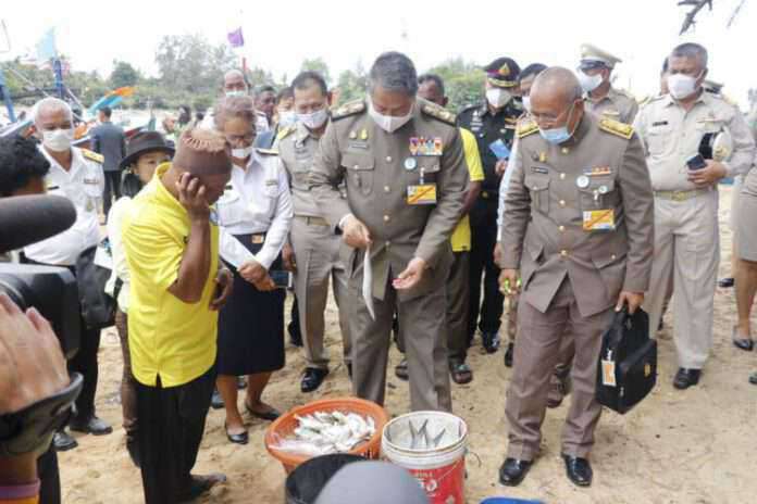 ต่อมา องคมนตรีได้เยี่ยมพบปะพูดคุยกับกลุ่มชาวประมงพื้นบ้านประมาณ 10 ลำ ที่มาจอดเรือบริเวณชายหาดหลังจากกลับจากหาปลาในทะเล โดยส่วนใหญ่บอกว่าหลังจากมีการทิ้งปะการังเทียมแล้ว ชาวประมงชายฝั่งสามารถจับปลาได้จำนวนมากขึ้น มีปลาหลากหลายชนิดมากขึ้น และสามารถนำมาจำหน่ายเป็นรายได้เลี้ยงครอบครัวได้ดีขึ้น