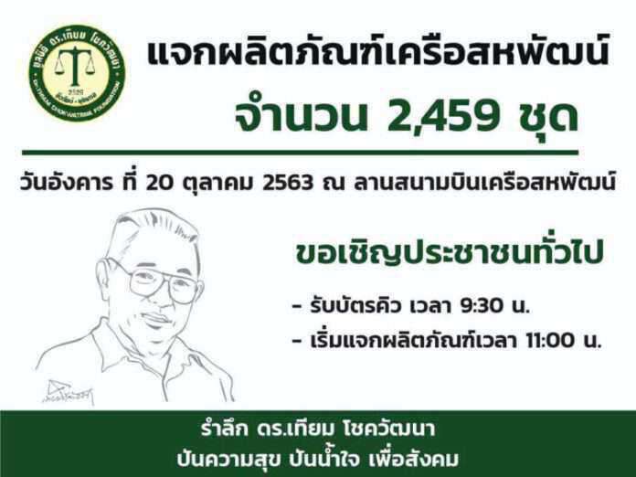 มูลนิธิ ดร.เทียม โชควัฒนา ร่วมกับ บริษัทในเครือสหพัฒน์ ขอเชิญประชาชนรับชุดผลิตภัณฑ์เครือสหพัฒน์ ฟรี ในโอกาสรำลึกถึง ดร.เทียม โชควัฒนา ผู้ก่อตั้งเครือสหพัฒน์ และเป็นการบรรเทาความเดือนร้อนของประชาชนจากสถานการณ์การแพร่ระบาดของโควิด-19 แต่ละชุดประกอบด้วยสินค้าอุปโภคบริโภคต่างๆ รวมทั้งสิ้น 2,459 ชุด โดยจะมีการแจกใน วันที่ 20 ตุลาคม 2563 ณ ลานสนามบินเครือสหพัฒน์ ศรีราชาเปิดให้รับบัตรคิวเวลา 09.30 น. และเริ่มแจกผลิตภัณฑ์เวลา 11.00 น.