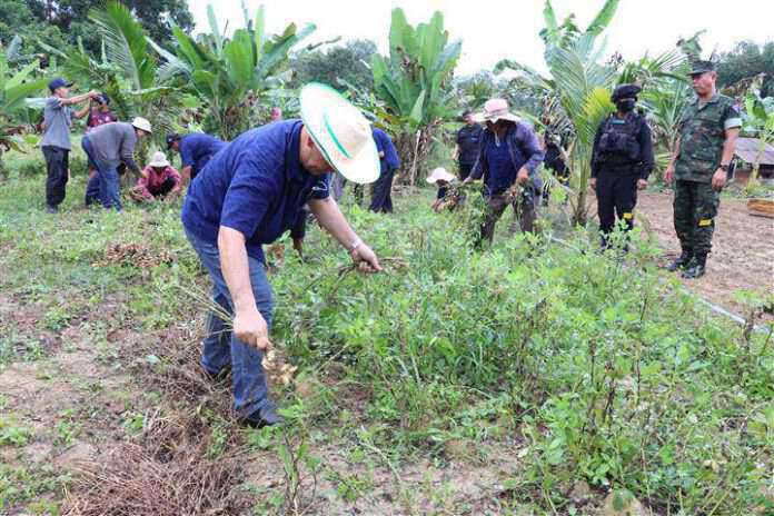 เกษตรกร ในพื้นที่ ต.ไม้แก่น อ.ไม้แก่น จ.ปัตตานี ร่วมแข่งขันถอนถั่วลิสง ในกิจกรรมวันรวมใจเก็บเกี่ยวผลผลิตถั่วลิสง ภายใต้โครงการส่งเสริมอาชีพทำการเกษตรตามวิถีชุมชน โดยศูนย์อำนวยการบริหารจังหวัดชายแดนภาคใต้ (ศอ.บต.) ร่วมกับ จังหวัดปัตตานี ส่งเสริมอาชีพแก่ประชาชนในพื้นที่ ต.ไม้แก่น ให้มีศักยภาพด้านการผลิต และการตลาด สามารถเพิ่มรายได้ให้กับเกษตรกรอีกทางหนึ่ง โดยได้ทำ MOU การซื้อขาย เมื่อวันที่ 17 ก.ค. 2563 ที่ผ่านมา ระหว่างวิสาหกิจชุมชนแปรรูปผลผลิตทางการเกษตรบ้านสารวัน (ถั่วคั่วทราย) กับกลุ่มส่งเสริมอาชีพการปลูกถั่วลิสง อ.ไม้แก่น จ.ปัตตานี ซึ่งวันนี้ภายในกิจกรรมมีเกษตรกรเข้าร่วมเป็นจำนวนมาก โดยมีเลขาธิการ ศอ.บต. พลเรือตรีสมเกียรติ ผลประยูร เป็นประธาน มีรองผู้ว่าราชการ จ.ปัตตานี และหัวหน้าส่วนราชการในพื้นที่เข้ากิจกรรมในครั้งนี้