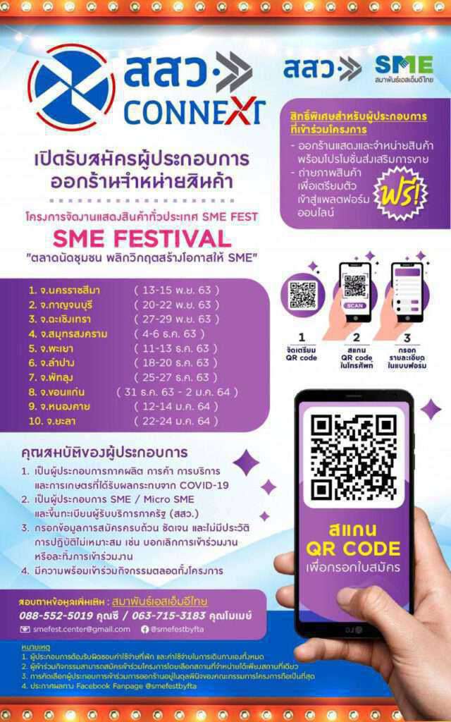 “งานแสดงสินค้า สสว. CONNEXT : SME Festival “ตลาดนัดชุมชน พลิกวิกฤต สร้างโอกาส ให้ SME” ภายใต้โครงการจัดงานแสดงสินค้าทั่วประเทศ SME FEST เกิดขึ้นเพื่อช่วยเหลือกลุ่มผู้ประกอบการเอสเอ็มอี / ไมโคร เอสเอ็มอี ภาคการผลิต การค้า และการบริการ ที่ได้รับผลกระทบจากสภาวะเศรษฐกิจชะลอตัว ได้แก่ สงครามการค้าสหรัฐ-จีน และ โควิด-19 จำนวนกว่า 2,000 ราย โดยมีวัตถุประสงค์สำคัญคือ เพื่อเพิ่มช่องทางในการแสดงและจำหน่ายสินค้าให้แก่ผู้ประกอบการเอสเอ็มอี การสร้างโอกาสทางการตลาดและบรรเทาผลกระทบจากสภาวะเศรษฐกิจให้แก่ผู้ประกอบการ รวมถึงเป็นการสร้างรายได้ให้กับเอสเอ็มอีและกระจายรายได้ให้เกิดการหมุนเวียนทั่วประเทศ”