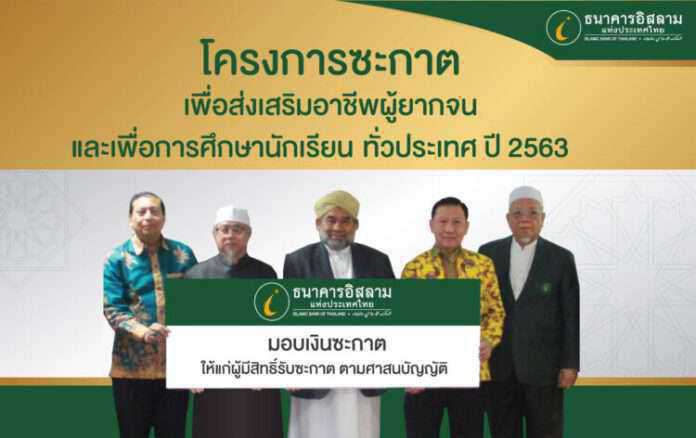 ผศ.ดร.มะรอนิง สาแลมิง ประธานที่ปรึกษาธนาคารอิสลามแห่งประเทศไทย และในฐานะประธานอนุกรรมการซะกาต พร้อมด้วย นายวุฒิชัย สุระรัตน์ชัย กรรมการและผู้จัดการธนาคาร ร่วมส่งมอบเงินซะกาตลูกค้าธนาคารจากบัญชีซะกาตธนาคาร ภายใต้ “โครงการซะกาตเพื่อส่งเสริมอาชีพผู้ยากจนและเพื่อการศึกษานักเรียนทั่วประเทศ ปี 2563” แบ่งเป็น เพื่อเป็นทุนประกอบอาชีพสำหรับผู้ยากจนทั่วประเทศ จำนวน 62 ราย และเป็นทุนการศึกษาแก่นักเรียนที่ขาดแคลนทุนทรัพย์ในระดับประถมศึกษา มัธยมศึกษา และปริญญาตรีทั่วประเทศ จำนวน 109 ราย รวมเป็นเงินทั้งสิ้น 1,034,000 บาท โดยมี อาจารย์สุธรรม บุญมาเลิศ เลขานุการจุฬาราชมนตรี ผู้แทนฯพณฯจุฬาราชมนตรี และอาจารย์อรุณ บุญชม ประธานคณะกรรมการอิสลามประจำกรุงเทพฯ เป็นผู้แทนรับมอบเงินซะกาต และ นายระบิล พรพัฒน์กุล กรรมการธนาคาร ร่วมเป็นสักขีพยาน ซึ่งโครงการที่จัดขึ้นในครั้งนี้ ได้รับความร่วมมือเป็นอย่างดีจากอิหม่ามในแต่ละจังหวัดทั่วประเทศเป็นผู้ทำการคัดเลือกผู้ยากจน รวมถึงนักเรียน นักศึกษาที่ขาด แคลนทุนทรัพย์เข้าเกณฑ์รับทุนซะกาต เพื่อเป็นทุนในการประกอบอาชีพ และเพื่อเป็นทุนการศึกษา ซึ่งเป็นไปตามกระบวนการบริหารจัดการซะกาตที่ธนาคารกำหนด ณ สำนักงานใหญ่ ธนาคารอิสลามแห่งประเทศไทย เมื่อวันที่ 11 พฤศจิกายน 2563 ที่ผ่านมา
