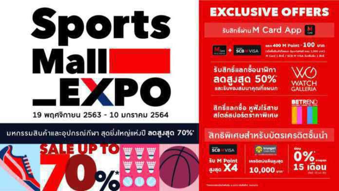 พบที่สุดของมหกรรมสินค้าและอุปกรณ์กีฬาแห่งปี ตอบโจทย์ทุกไลฟ์สไตล์คนรักกีฬา และกิจกรรมมากมาย ในงาน “สปอร์ตมอลล์ เอ็กซ์โป 2020” ระหว่างวันที่ 19 พฤศจิกายน 2563 – 10 มกราคม 2564 ที่ สปอร์ตมอลล์ เดอะมอลล์ ทุกสาขา, เดอะมอลล์ไลฟ์สโตร์ งามวงศ์วาน, เอ็มควอเทียร์, เอ็มโพเรียม และพารากอน ดีพาร์ทเม้นท์สโตร์ (ยกเว้น รามคำแหง และบลูพอร์ตหัวหิน)
