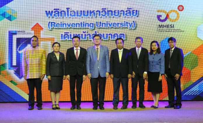 25 พฤศจิกายน 2563 – กระทรวงการอุดมศึกษา วิทยาศาสตร์ วิจัยและนวัตกรรม(อว.)เดินหน้าผลักดันโครงการพลิกโฉมมหาวิทยาลัย(Reinventing University) เพื่อให้สถาบันอุดมศึกษาทั่วประเทศ ปฏิรูปการบริหารงานและปรับเปลี่ยนหลักสูตรการสอนให้ทันต่อการเปลี่ยนแปลงของสังคม สามารถผลิตบุคคลากรคุณภาพสูง มุ่งตอบสนองความต้องการตลาด เพื่อเพิ่มขีดความสามารถทางการแข่งขันให้กับประเทศ พร้อมยกระดับคุณภาพมหาวิทยาลัยไทยให้ทัดเทียมนานาชาติและเป็นกลไกสำคัญในการขับเคลื่อนประเทศสู่ยุค 4.0 ได้อย่างสมบูรณ์