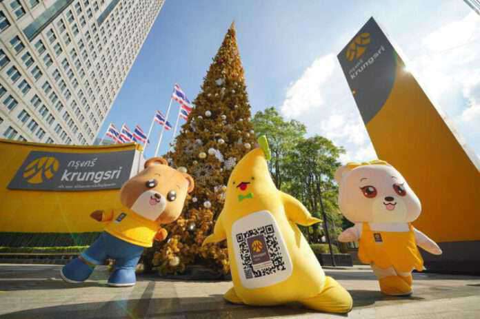 นางสาวมิ่งขวัญ พัฒนวงศ์ ผู้ช่วยกรรมการผู้จัดการใหญ่ ผู้บริหารสายงานบริหารแบรนด์และการตลาดองค์กร ธนาคารกรุงศรีอยุธยา จำกัด (มหาชน) เปิดเผยว่า “กรุงศรีได้เตรียมมอบความสุขพิเศษให้กับคนไทยในช่วงเทศกาลคริสต์มาส ส่งท้ายปีเก่าต้อนรับปีใหม่อย่างต่อเนื่อง ปีนี้ก็เช่นกัน โดยได้จัดกิจกรรมส่งความสุขตลอดเดือนธันวาคม สะท้อนแนวคิด “ความห่วงไม่เคยห่าง กรุงศรีอยู่นี่นะ” และเพื่อเป็นการส่งความสุขให้ทั่วถึงคนไทยได้มากที่สุด จึงมีทั้งกิจกรรมบนช่องทางออนไลน์และกิจกรรมออนกราวด์ ให้ทุกคนได้มีโอกาสยิ้มรับความสุขและความสนุกสนานส่งท้ายปี โดยประดับไฟพื้นที่ด้านหน้าของสำนักงานใหญ่ พระราม 3 และอาคารสำนักงานเพลินจิตของกรุงศรี ด้วยต้นคริสต์มาสสีทองขนาดใหญ่ จำลองบรรยากาศและกลิ่นอายสไตล์ญี่ปุ่นด้วยซุ้มโทริอิ พร้อม Snow Globe ที่ทุกคนสามารถเข้าไปถ่ายรูปได้ฟรี ถือเป็นอีกหนึ่งจุดเช็คอินกลางกรุงที่เชิญชวนให้ประชาชนมาเดินเที่ยวถ่ายรูป และเตรียมพบกับเซอร์ไพรส์ความสุขจากมาสคอตชื่อดัง ‘น้องกล้วยกรุงศรี’ ที่ครั้งนี้ไม่ได้มาคนเดียว แต่จะมาแนะนำเพื่อนร่วมแก๊ง ‘บิลลี่’ หมีสุดเท่ ทันสมัย เชี่ยวชาญเรื่องเงินและเทคโนโลยี และ ‘เบลล่า’ หมีสุดน่ารัก ที่มาพร้อมความร่าเริง เป็นมิตร และชอบช่วยเหลือ โดยทั้งสามเป็นตัวแทนทำหน้าที่ส่งมอบความสุขและความห่วงให้กับลูกค้ากรุงศรีอย่างต่อเนื่อง โดยภารกิจแรกสำหรับในช่วงเทศกาลแห่งความสุขส่งท้ายปี ทั้งสามจะออกสร้างความสุขในสถานที่จุดเช็คอินต่างๆ กลางกรุง เพื่อส่งมอบความสุขและของขวัญแทนความห่วงใยจากกรุงศรี และในส่วนออนไลน์ กรุงศรียังเตรียมออกสติ๊กเกอร์ชุดใหม่ เพื่อให้ประชาชนทั่วไปได้ดาวน์โหลดมาส่งต่อความห่วงใยและความสุขให้แก่กันในช่วงเทศกาลอีกด้วย”