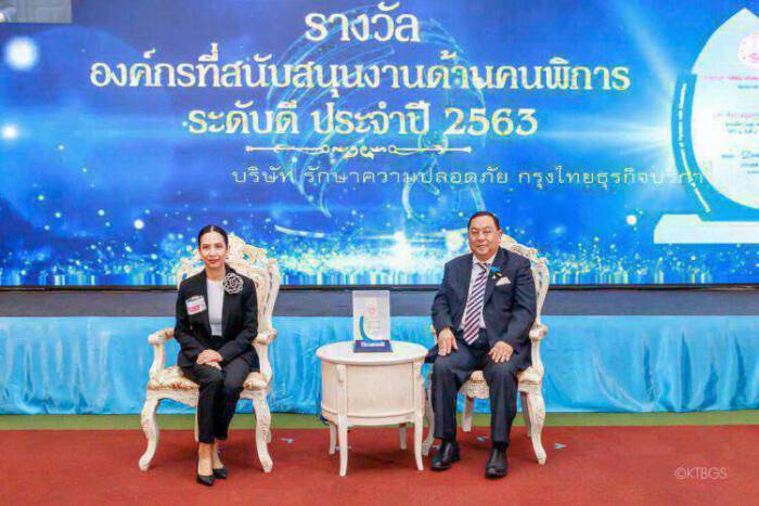 นางอรจรรยา จันทวรสุทธิ์ (ซ้าย) กรรมการผู้จัดการ บริษัทรักษาความปลอดภัย กรุงไทยธุรกิจ บริการ จำกัด (KTBGS) ได้รับเกียรติจาก คุณจุติ ไกรฤกษ์ (ขวา) รัฐมนตรีว่าการกระทรวงการพัฒนาสังคมและความมั่นคงของมนุษย์ เป็นผู้แทน นายกรัฐมนตรี มอบโล่รางวัล “องค์กรที่สนับสนุนงานด้านคนพิการ ระดับดี ประจำปี 2563” ณ กระทรวงการพัฒนาสังคมและความมั่นคงของมนุษย์ เมื่อเร็วๆนี้