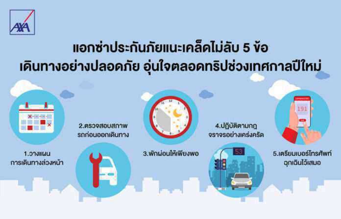 แอกซ่ามีความห่วงใยและพร้อมดูแลลูกค้าตลอดช่วงเทศกาลปีใหม่นี้ พร้อมนำเสนอแผนประกันภัยรถยนต์ที่เหมาะกับการขับขี่ทุกรูปแบบ เช่น ประกันภัยรถยนต์ชั้น 1, ประกันภัยรถยนต์ชั้น 2+ และประกันภัยรถยนต์ชั้น 3+ พร้อมมอบสิทธิประโยชน์มากมายให้แก่ลูกค้าผ่านบริการสุดพิเศษ “แอกซ่า โรดไซด์ เซอร์วิส” บริการช่วยเหลือฉุกเฉินทุกที่ตลอด 24 ชั่วโมง “แอกซ่าฟอร์ยู” ไม่หักค่าเสื่อมราคาที่เกิดจากอุบัติเหตุสำหรับยางรถยนต์ แบตเตอรี่ วิทยุและเครื่องเสียงที่ติดตั้งมาจากโรงงานประกอบรถยนต์ และ “แอกซ่า ชัวร์” บริการสำรวจอุบัติเหตุภายในเวลาที่กำหนดไม่เกิน 30 นาที ผู้สนใจสามารถซื้อกรมธรรม์ประกันภัยรถยนต์ของแอกซ่าได้ที่เว็บไซต์ www.axa.co.th/private-car-insurance