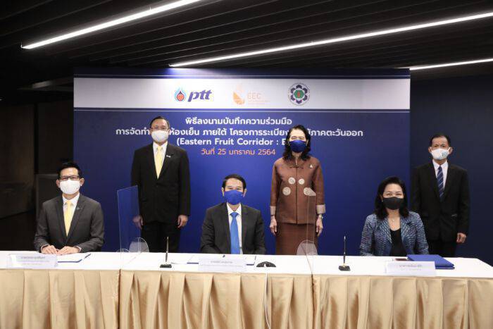 เมื่อเร็วๆ นี้ – นายอรรถพล ฤกษ์พิบูลย์ ประธานเจ้าหน้าที่บริหารและกรรมการผู้จัดการใหญ่ บริษัท ปตท. จำกัด (มหาชน) (ปตท.) นายคณิศ แสงสุพรรณ เลขาธิการคณะกรรมการนโยบายเขตพัฒนาพิเศษภาคตะวันออก(สกพอ.) และนางสาวสมจิณณ์ พิลึก ผู้ว่าการการนิคมอุตสาหกรรมแห่งประเทศไทย (กนอ.) ร่วมพิธีลงนามบันทึกข้อตกลงความร่วมมือการจัดทำระบบห้องเย็น (Blast freezer & Cold storage) ภายใต้โครงการระเบียงผลไม้ภาคตะวันออก (Eastern Fruit Corridor: EFC) โดยมีนายสุพัฒนพงษ์ พันธ์มีเชาว์ รองนายกรัฐมนตรีและรัฐมนตรีว่าการกระทรวงพลังงาน เป็นประธาน และนายสุริยะ จึงรุ่งเรืองกิจ รัฐมนตรีว่าการกระทรวงอุตสาหกรรม ร่วมเป็นสักขีพยาน เพื่อส่งเสริมการพัฒนาระบบห้องเย็น และโครงสร้างพื้นฐานที่เกี่ยวข้องกับการเก็บรักษาและคงคุณภาพผลผลิตทาง การเกษตร โดย ปตท. จะเป็นผู้ลงทุนจัดทำระบบห้องเย็นทันสมัยขนาด 4,000 ตัน ที่นำพลังงานความเย็นจากกระบวนการแปรสภาพของก๊าซธรรมชาติเหลว (LNG) มาใช้ประโยชน์ เพื่อผลิตไนโตรเจนเหลวสำหรับนำไปใช้ใน Blast freezer ช่วยรักษาคุณภาพผลไม้ให้เสมือนเพิ่งเก็บจากสวน และสร้างระบบ Cold storage ที่สามารถคงคุณภาพผลผลิตทางการเกษตรให้ขายได้ตลอดทั้งปี พร้อมพัฒนาระบบบริหารจัดการคู่ค้าในรูปแบบดิจิทัลแพลตฟอร์ม ทางด้าน กนอ. จะเป็นผู้จัดหาพื้นที่บริเวณนิคมอุตสาหกรรม Smart Park อ.มาบตาพุด จ.ระยอง และ สกพอ. จะประสานความร่วมมือส่งเสริมด้านสิทธิประโยชน์ให้หน่วยงานรัฐและเอกชน โดยจะนำร่องด้วยทุเรียนและขยายผลสู่ผลิตภัณฑ์อื่น ๆ เพื่อช่วยสร้างรายได้ที่มั่นคงให้กับเกษตรกร ลดปัญหาผลผลิตทางการเกษตรขาดแคลนหรือล้นตลาด เพิ่มขีดความสามารถการแข่งขันทางเศรษฐกิจของประเทศ ตลอดจนสร้างมูลค่าเพิ่มให้ภาคการเกษตรไทยสู่สากลอย่างยั่งยืน