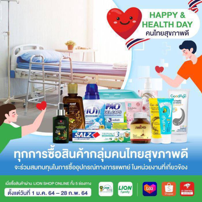บริษัท ไลอ้อน (ประเทศไทย) จำกัด ผู้ผลิตและจำหน่ายสินค้าอุปโภคบริโภคเพื่อคนไทย มุ่งมั่นดำเนินธุรกิจพัฒนาสินค้านวัตกรรม เพื่อสุขภาวะที่ดีของผู้บริโภคอย่างต่อเนื่อง ตามแนวทางการนำความดีสู่สังคม สร้างสุขภาวะที่ดีสู่ผู้บริโภค จัดแคมเปญ “HAPPY & HEALTHY DAY คนไทยสุขภาพดี” เชิญชวนผู้บริโภคร่วมเป็นส่วนหนึ่งในการร่วมสมทบทุนในการซื้ออุปกรณ์ทางการแพทย์ ส่งต่อกำลังใจให้กับทีมแพทย์พยาบาล หน่วยงานที่ขาดแคลนด้วยการสั่งซื้อสินค้ากลุ่มคนไทยสุขภาพดีผ่าน LION SHOP ONLINE ทั้ง 5 ช่องทาง ได้แก่ 1) เว็บไซต์ www.lionshoponline.com 2) LINE @LIONFAMILY 3) Lazada https://bit.ly/2SnxZEB 4) Shopee https://bit.ly/2CpCzwT 5) JD CENTRAL https://sl.jd.co.th/100-1JvM ตั้งแต่วันที่ 1 ม.ค. ถึง 28 ก.พ.64 ผู้สนใจสามารถติดตามรายละเอียดรวมทั้งกิจกรรมอื่นๆ เพิ่มเติมได้ทาง FB : LionFamilyThailand https://www.facebook.com/LionFamilyThailand และเว็บไซต์ https://www.lion.co.th/