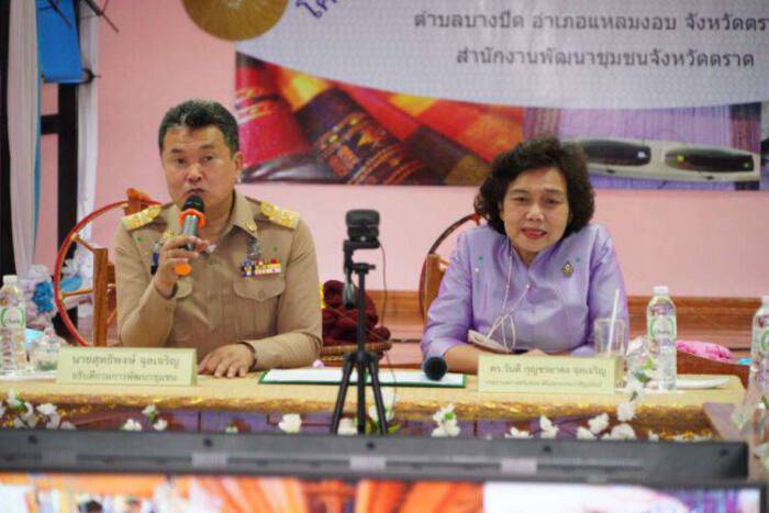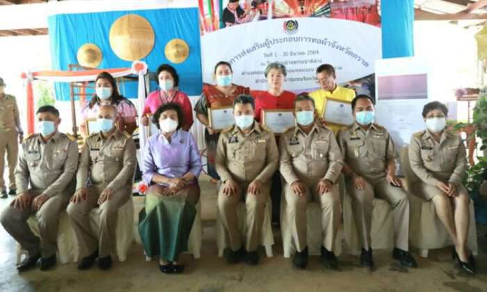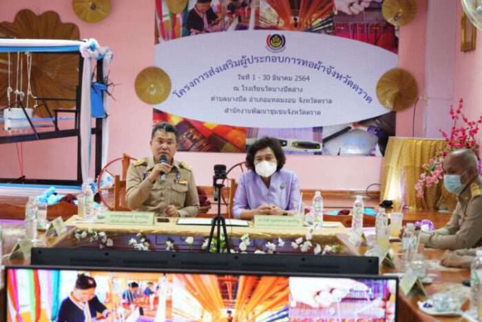 นายสุทธิพงษ์ จุลเจริญ อธิบดีกรมการพัฒนาชุมชน กล่าวขอบคุณ ดร.วันดี กุญชรยาคง จุลเจริญ ประธานสภาสตรีแห่งชาติในพระบรมราชินูปถัมภ์ ภาคีเครือข่ายในการขับเคลื่อนการอนุรักษ์ศิลป์ผ้าถิ่นไทย ที่เป็นภาคีเครือข่ายของกรมการพัฒนาชุมชนมาอย่างดี และนายกัฬชัย เทพวรชัย รองผู้ว่าราชการจังหวัดตราด รวมถึงนายสุรศักดิ์ อักษรกุล รองอธิบดีกรมการพัฒนาชุมชน นางสาวเบญจมาส วงษ์สุวรรณ ผู้ตรวจราชการกรม และนายมนตรี ฮมแสน พัฒนาการจังหวัดตราด รวมถึงผู้ประกอบการ OTOP จำนวน 24 ราย ที่มอบกี่ทอผ้า ถือว่าเป็นวันประวัติศาสตร์ผ้าไทยในประเทศไทยที่มีการทอผ้าทั้ง 77 จังหวัด โดยจังหวัดตราด เป็นประเทศที่ 77 ในการทอผ้า จะเห็นได้ว่า การทอผ้ามีมาตั้งแต่สมัยรัตนโกสินทร์ จนถึงปัจจุบัน โดยเฉพาะการทอผ้าไหมที่มีชื่อเสียงมายาวนานคือ กลุ่มบ้านครัว สะพานหัวช้าง เป็นกลุ่มทอผ้าที่มีอายุมากกว่า 200 ปี มาจนถึงทุกวันนี้ ในสมัยอดีตจังหวัดตราดได้มีการทอผ้า แต่ได้ห่างหายไปเรื่อยๆ ทำให้เราต้องมากระตุ้น ฟื้นฟู ศิลปวัฒนธรรมการทอผ้าของคนจังหวัดตราด ขึ้นมา เพื่ออนุรักษ์ศิลป์ผ้าถิ่นไทยไว้ ตามที่สมเด็จพระกนิษฐาธิราชเจ้า กรมสมเด็จพระเทพรัตนราชสุดาฯ สยามบรมราชกุมารี ได้มีพระราชดำรัสแก่ประธานสภาสตรีแห่งชาติในพระบรมราชินูปถัมภ์ ได้ทราบในประเทศไทยมีการทอเกือบทุกจังหวัด ยกเว้น 3 จังหวัด ที่ไม่มีผ้าเป็นของตัวเอง คือ สมุทรสาคร สมุทรปราการ และตราด แต่ในช่วง 2 ปี โดยสมุทรสาครมีรูปแบบผ้าปักลายปลาทู เช่นเดียวกับสมุทรปราการก็มีการทอผ้าแล้ว เป็นความโชคดีของจังหวัดตราด ที่ทำให้เกิดความตื่นตัวอยากทอผ้า ในการรักษาภูมิปัญญาท้องถิ่นของบรรพบุรุษ เพื่อสนองพระราชดำริ สมเด็จพระนางเจ้าสิริกิติ์ พระบรมราชินีนาถ พระบรมราชชนนีพันปีหลวง ที่พระองค์ทรงรื้อฟื้นผ้าทั่วประเทศ เป็นการสนองงาน สมเด็จพระกนิษฐาธิราชเจ้า กรมสมเด็จพระเทพรัตนราชสุดาฯ สยามบรมราชกุมารี ที่ทรงอยากเห็นคนไทยคงรักษาภูมิปัญญาผ้าไทย และที่ต่อเนื่องมาจนถึงปัจจุบัน สมเด็จพระนางเจ้าสุทิดา พัชรสุธาพิมลลักษณ พระบรมราชินี ทรงมีพระราชปณิธาน ในวันสตรีไทย 1 สิงหาคม 2562 จะสนองพระเดชพระคุณ พระมหากรุณาธิคุณ ในการสืบสาน รักษา และต่อยอด พระราชปณิธานแห่งสมเด็จพระนางเจ้าสิริกิติ์ พระบรมราชินีนาถ พระบรมราชชนนีพันปีหลวง เหมือนดั่งที่พระบาทสมเด็จพระเจ้าอยู่หัว ทรงตั้งพระราชปณิธานที่จะสืบสาน รักษา และต่อยอด และแผ่ขยายพระบารมีแห่งสมเด็จพระบรมชนกนาถ และสมเด็จพระบรมราชชนนี ดำรงรักษาผ้าถิ่นไทยไว้ รวมถึงสมเ