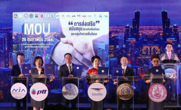 เมื่อเร็ว ๆ นี้ – นางสาวดวงพร เที่ยงวัฒนธรรม รองกรรมการผู้จัดการใหญ่กำกับองค์กรและกิจการสัมพันธ์ บริษัท ปตท.จำกัด (มหาชน) (ที่ 2 จากซ้าย) ในฐานะผู้แทนบริษัท ปตท. จำกัด (มหาชน) เข้าร่วมพิธีลงนามบันทึกข้อตกลงความร่วมมือ (MOU) “การส่งเสริม สนับสนุน วิสาหกิจเพื่อสังคมและกลุ่มกิจการเพื่อสังคม” ร่วมกับหน่วยงานภาครัฐและเอกชน 18 หน่วยงาน โดยได้รับเกียรติจาก นายจุรินทร์ ลักษณวิศิษฏ์ รองนายกรัฐมนตรี และรัฐมนตรีว่าการกระทรวงพาณิชย์ เป็นประธานในพิธี ซึ่งความร่วมมือดังกล่าว ปตท. จะช่วยส่งเสริม สนับสนุน ช่องทางการจัดจำหน่ายสินค้า ให้กับวิสาหกิจเพื่อสังคมและกลุ่มกิจการเพื่อสังคม ทั้งทางออนไลน์ผ่าน www.ชุมชนยิ้มได้.com และสนับสนุนการประชาสัมพันธ์สินค้าและบริการในช่องทางการสื่อสารของ ปตท. มุ่งทำให้เกิดการแลกเปลี่ยนข้อมูลเปิด (Open Data) ที่เกี่ยวข้องกับวิสาหกิจเพื่อสังคม และกลุ่มกิจการเพื่อสังคมที่กว้างมากขึ้น พร้อมทั้งสร้างความร่วมมือระหว่างกันในการขับเคลื่อนการดำเนินงาน ด้านการส่งเสริมวิสาหกิจเพื่อสังคมให้เกิดความยั่งยืน