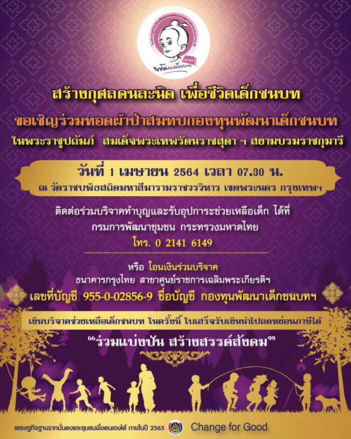 กรมการพัฒนาชุมชน กำหนดจัดกิจกรรมทอดผ้าป่าสมทบกองทุนพัฒนาเด็กชนบท ในพระราชูปถัมภ์ สมเด็จพระเทพรัตนราชสุดาฯ สยามบรมราชกุมารี ในวันที่ 1 เมษายน 2564 ตั้งแต่ เวลา 7.30 น. ณ วัดราชบพิธสถิตมหาสีมารามราชวรวิหาร โดยมีวัตถุประสงค์เพื่อช่วยเหลือเด็กก่อนวัยเรียนอายุตั้งแต่แรกเกิดถึงหกปีที่ครอบครัวยากจนและด้อยโอกาสในชนบท ให้ได้รับการพัฒนาทั้งด้านร่างกาย จิตใจ อารมณ์ สังคม และสติปัญญา โดยให้ทุนอุปการะสนับสนุนอุปกรณ์การเรียนการสอน เครื่องนุ่งห่มและสนับสนุนกิจกรรมพัฒนาเด็กส่วนที่เกินขีดความสามารถของพื้นที่ ตลอดจนการช่วยเหลือครอบครัวเด็กที่ประสบภัยธรรมชาติ