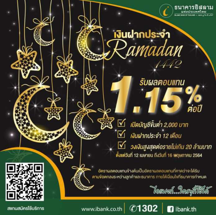 ธนาคารอิสลามแห่งประเทศไทย (ไอแบงก์) ออกผลิตภัณฑ์เงินฝากประจำสุดพิเศษให้พี่น้องมุสลิมเนื่องในโอกาสเข้าสู่เดือนรอมฎอนอันประเสริฐ ด้วยโครงการเงินรับฝากประจำ “Ramadan 1442” ระยะเวลาการฝาก 12 เดือน มีผลตอบแทนที่คาดว่าจะได้รับสูงถึง 1.15% ต่อปี เปิดบัญชีขั้นต่ำ 2,000 บาท