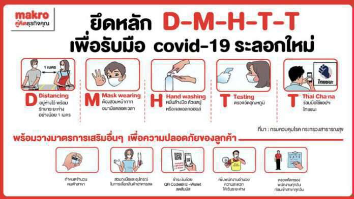 บริษัท สยามแม็คโคร จำกัด (มหาชน) ขานรับแนวทางของกระทรวงสาธารณสุข “DMHTT” D : Distancing คือ เว้นระยะห่างระหว่างกัน M : Mask wearing คือ สวมหน้ากากผ้า/หน้ากากอนามัยตลอดเวลา H : Hand washing คือ ล้างมือบ่อย ๆ T : Testing คือ ตรวจวัดอุณหภูมิร่างกายก่อนเข้าใช้บริการ T : Thai Cha Na คือ เช็กอินผ่านแอปพลิเคชัน “ไทยชนะ” เตรียมพร้อมรับมือโควิดรอบใหม่ เติมความเข้มข้นแผนป้องกันสูงสุดทุกสาขาทั่วประเทศ รวมถึงศูนย์กระจายสินค้า ย้ำสถานประกอบการปลอดภัยไร้โควิด-19 ปฏิบัติการเชิงรุกให้พนักงาน – ลูกค้า การ์ดอย่าตก