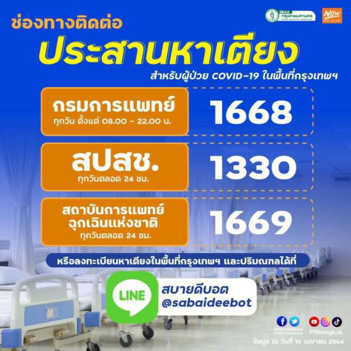 นางศิลปสวย ระวีแสงสูรย์ ปลัดกรุงเทพมหานคร กล่าวถึงการจัดเตรียมเตียง ICU และบุคลากรทางการแพทย์ของกรุงเทพมหานคร เพื่อรองรับการรักษาพยาบาลผู้ป่วยโควิด-19 ที่เพิ่มขึ้นว่า จากสถานการณ์ที่มีผู้ป่วยโควิด-19 เพิ่มขึ้นจำนวนมากในแต่ละวัน กรุงเทพมหานคร โดยสำนักการแพทย์ได้ประชุมหารือร่วมกับหน่วยงานที่เกี่ยวข้อง เพื่อเตรียมสร้าง ICU เพิ่มเติมโดยเร่งด่วน พร้อมเตรียมบุคลากรทางการแพทย์และเครื่องมืออุปกรณ์ทางการแพทย์ รวมถึงหมุนเวียนปรับโยกย้ายผู้ป่วยตามอาการ ตลอดจนปรับหอผู้ป่วยเตียงรวมที่ไม่มีห้องแยก (cohort COVID-ICU) เพื่อความเหมาะสม นอกจากนี้ ยังได้ประสานความร่วมมืออย่างใกล้ชิดกับกระทรวงสาธารณสุขและหน่วยงานภาคีที่เกี่ยวข้องทั้งภาครัฐและเอกชนในการบริหารจัดการเตียง ICU เพื่อรองรับผู้ป่วยโควิด-19 ที่มีอาการหนัก ซึ่งศูนย์บริการการแพทย์ฉุกเฉินกรุงเทพมหานคร หรือศูนย์เอราวัณ จะเป็นหน่วยบริหารจัดการเตียงผู้ป่วยโควิด-19 และการจัดสรรเตียงในพื้นที่กรุงเทพฯ ให้ผู้ป่วยตามระดับความรุนแรงของโรค พร้อมบริหารรถนำส่งผู้ป่วย ซึ่งเป็นเครือข่ายบริการการแพทย์ฉุกเฉินกรุงเทพมหานคร และภาคีเครือข่ายที่เกี่ยวข้อง โดยคัดแยกผู้ป่วยตามระดับอาการ ดังนี้ (1) “ผู้ป่วยสีเขียว” คือ ผู้ติดเชื้อโควิด-19 ที่ไม่มีอาการ หรือมีอาการเล็กน้อย เช่น มีประวัติไข้ หรือวัดอุณหภูมิได้ตั้งแต่ 37.5 องศาฯ ขึ้นไป ไอ มีน้ำมูก เจ็บคอ ไม่ได้กลิ่น ลิ้นไม่รับรส ตาแดง ผื่น ถ่ายเหลว (2) “ผู้ป่วยสีเหลือง” คือ ผู้ติดเชื้อโควิด-19 ที่มีอาการไม่รุนแรง เริ่มมีอาการหายใจเร็ว หายใจเหนื่อย หรือมีปัจจัยเสี่ยงต่อการเป็นโรครุนแรง หรือมีโรคร่วมสำคัญข้อใดข้อหนึ่ง ได้แก่ อายุมากกว่า 60 ปี โรคปอดอุดกั้นเรื้อรัง (รวมโรคปอดเรื้อรังอื่นๆ) โรคไตเรื้อรัง โรคหัวใจและหลอดเลือด (รวมโรคหัวใจแต่กำเนิด) โรคหลอดเลือดสมอง เบาหวานที่ควบคุมไม่ได้ ภาวะอ้วน (น้ำหนักมากกว่า 90 กิโลกรัม) ตับแข็ง และภาวะภูมิคุ้มกันต่ำ (wbc < 1,000 cell/mm3) และ (3) “ผู้ป่วยสีแดง” คือ ผู้ติดเชื้อโควิด-19 ที่มีอาการหอบเหนื่อยเวลาเดิน หายใจลำบาก พบปอดอักเสบ มีภาวะปอดบวม (ความอิ่มตัวของเลือด < 96%) หรือความอิ่มตัวของเลือดลดลง > 3% หลังออกแรง ทั้งนี้เมื่อประเมินอาการผู้ป่วยแล้วจะนำส่งไปยังสถานพยาบาลต่อไป โดยการรับ-ส่งผู้ป่วยในแต่ละวันจะดำเนินการตั้งแต่เวลา 08.00 – 20.00 น. หากผู้ป่วยตกค้าง หรือรอคิวเป็นเวลานานสามารถประสานแจ้งข้อมูลได้ที่หมายเลขสายด่วนกรมการแพทย์ 1668 สายด่วน 1330 ศูนย์เอราวัณ กทม. โทร. 1669 และสามารถแจ้งข้อมูลผ่านแอปพลิเคชัน Line @sabaideebot ได้อี