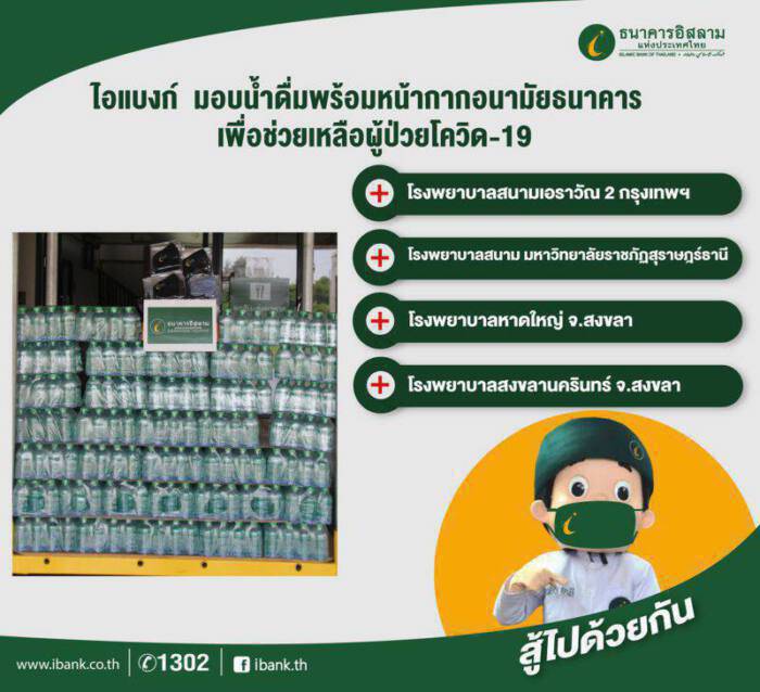 ธนาคารอิสลามแห่งประเทศไทย (ไอแบงก์) นำน้ำดื่มสะอาดบรรจุขวดตราสัญลักษณ์ธนาคาร รวมจำนวน 3,960 ขวด พร้อมหน้ากากอนามัย และสิ่งของจำเป็น ไปมอบให้หน่วยงานต่าง ๆ ประกอบด้วย โรงพยาบาลสนามเอราวัณ 2 สนามกีฬาบางกอกอารีนา เขตหนองจอก กรุงเทพฯ โรงพยาบาลสนามมหาวิทยาลัยราชภัฏสุราษฎร์ธานี โรงพยาบาลหาดใหญ่ จ.สงขลา และโรงพยาบาลสงขลานครินทร์ จ.สงขลา เพื่อนำไปแจกจ่ายช่วยเหลือผู้ป่วยโควิด-19 ระลอกใหม่