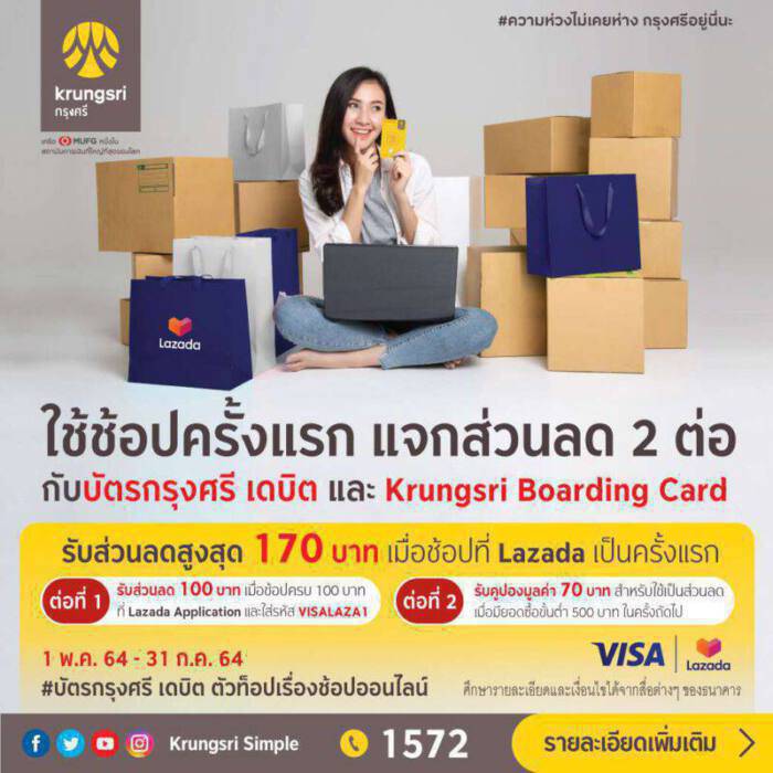กรุงศรี (ธนาคารกรุงศรีอยุธยา จำกัด (มหาชน)) ร่วมกับ บริษัท วีซ่า อินเตอร์เนชั่นแนล (ประเทศไทย) มอบส่วนลด 2 ต่อ สำหรับลูกค้าผู้ถือบัตรกรุงศรี เดบิต และ Krungsri Boarding Card ที่ช้อปบน Lazada Application เป็นครั้งแรก โดยต่อที่ 1 รับส่วนลด 100 บาท เมื่อช้อปครบ 100 บาท และใส่รหัส VISALAZA1 โดยเลือกบัตรกรุงศรี เดบิต หรือ Krungsri Boarding Card ก่อนทำการชำระเงินเท่านั้น และต่อที่ 2 รับคูปองมูลค่า 70 บาท สำหรับใช้เป็นส่วนลดเมื่อมียอดซื้อขั้นต่ำ 500 บาท ในการช้อปครั้งถัดไป (คูปองส่วนลดมีอายุ 30 วัน หลังจากได้รับ) สงวนสิทธิ์ 1 สิทธิ์/ 1 ผู้ใช้งาน จำกัด 10,000 สิทธิ์ ตั้งแต่วันนี้ – 31 ก.ค. 64 หรือจนกว่าสิทธิ์จะหมด