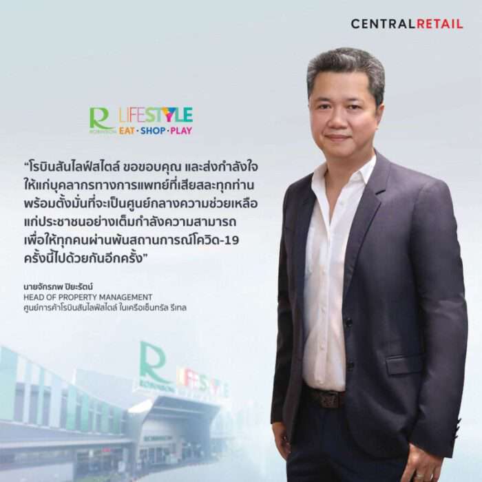 นายจักรภพ ปิยะรัตน์ HEAD OF PROPERTY MANAGEMENT ศูนย์การค้า​โรบินสันไลฟ์สไตล์ ในเครือเซ็นทรัล รีเทล กล่าวว่า ในฐานะศูนย์การค้าฯ ที่มีสาขาครอบคลุมทั่วทุกภูมิภาคของประเทศ และเป็น Center of Community เรามีความพร้อมและตั้งมั่นที่จะเป็นศูนย์กลางในการช่วยเหลือและสนับสนุนสังคมไทยในทุกภาคส่วน ทั้งหน่วยงานภาครัฐ บุคลากรทางการแพทย์ และประชาชนทั่วประเทศ เพื่อแก้ปัญหาในช่วงวิกฤตการณ์ โควิด-19 ในปัจจุบัน ผ่าน 5 กิจกรรมเพื่อสังคมที่สำคัญ ซึ่งประกอบด้วย 2 กิจกรรมใหญ่ ได้แก่
