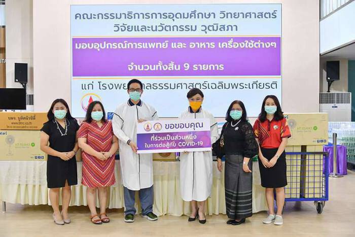 คณะกรรมาธิการการอุดมศึกษา วิทยาศาสตร์ วิจัยและนวัตกรรม วุฒิสภา โดย ดร.ศิรินา ปวโรฬารวิทยา มอบเครื่องมือแพทย์และอุปกรณ์ที่จำเป็นเพื่อใช้ในโรงพยาบาลสนามในกำกับอุดมศึกษา ในโครงการ “รวมน้ำใจ กมธ.อววน. วุฒิสภา” แก่โรงพยาบาลธรรมศาสตร์เฉลิมพระเกียรติ ซึ่งมี นพ. ปรีดิ์ นิมมานนิตย์ ผู้ช่วยผู้อำนวยการฝ่ายวางแผนงบประมาณ เป็นผู้รับมอบชุด PPE หน้ากากอนามัย เครื่องอุปโภค-บริโภค ฯลฯ เพื่อช่วยเหลือประชาชนในสถานการณ์โควิด-19 รวมถึงได้กล่าวขอบคุณบุคลากรการแพทย์ที่ร่วมแรง ร่วมใจ ร่วมมือกัน เพื่อให้ผ่านวิกฤตการณ์นี้ ณ โรงพยาบาลธรรมศาสตร์เฉลิมพระเกียรติ มหาวิทยาลัยธรรมศาสตร์ ศูนย์รังสิต