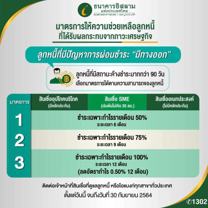 ธนาคารอิสลามแห่งประเทศไทย (ไอแบงก์) เดินหน้าช่วยลูกหนี้ที่ค้างชำระมากกว่า 90 วัน (NPF : Non-Performing Financing) กลุ่มสินเชื่ออุปโภค บริโภคและสินเชื่อธุรกิจ SMEs ที่ได้รับผลกระทบทั้งจากภาวะเศรษฐกิจและจากการแพร่ระบาดของโควิด – 19 โดยสามารถเลือกแนวทางความช่วยเหลือ 3 แนวทาง