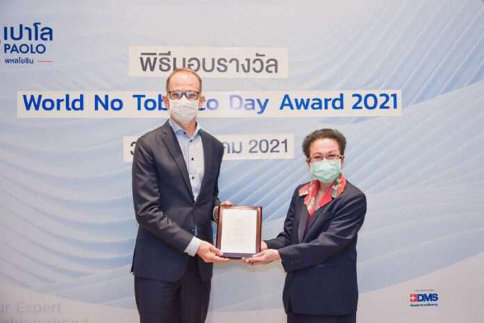 เมื่อเร็ว ๆ นี้ ดร. ดาเนียล เคอร์เทซ ผู้แทนองค์การอนามัยโลกประจำประเทศไทย (ซ้าย) มอบรางวัล Regional Director’s Special Recognition Award จากองค์การอนามัยโลก ภูมิภาคเอเชียตะวันออกเฉียงใต้ (WHO SEARO) ให้แก่ พญ. อารยา ทองผิว อายุรแพทย์เฉพาะทางเบาหวาน และต่อมไร้ท่อ โรงพยาบาลเปาโล พหลโยธิน (ขวา) ในงาน “World No Tobacco Day Award 2021” เนื่องในวันงดสูบบุหรี่โลก ประจำปี พ.ศ. 2564 ณ โรงพยาบาลเปาโล ในฐานะผู้ดำเนินงานด้านการส่งเสริม และสนับสนุนเครือข่ายวิชาชีพในการควบคุมการบริโภคยาสูบ ในโครงการรณรงค์เลิกสูบบุหรี่ ซึ่งเริ่มดำเนินการมาตั้งแต่ปี 2551 โดย พญ. อารยา ได้ช่วยให้ผู้ป่วยโรคไม่ติดต่อเรื้อรังละเลิกการสูบบุหรี่ได้สูงถึง 46% จากผู้ป่วยที่ร่วมโครงการกว่า 1,500 คน นอกจากนี้ยังเป็นหัวหน้าโครงการเลิกบุหรี่ในโรคเรื้อรัง ขณะนี้มีแม่ข่ายทุกเขตของกระทรวงสาธารณสุข และกทม. รวม 13 เขต ซึ่งจะดำเนินการอย่างต่อเนื่อง