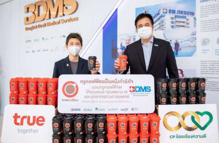 นายบุรณัชย์ ลิมจิตติ ผู้ช่วยกรรมการผู้อำนวยการใหญ่อาวุโส ด้านการตลาดต่างประเทศ, โฆษณา และประชาสัมพันธ์ บริษัท กรุงเทพดุสิตเวชการ จำกัด (มหาชน) หรือ BDMS เป็นผู้แทนรับมอบผลิตภัณฑ์กาแฟ ทรู คอฟฟี่คัพ ในรูปแบบพร้อมดื่ม จำนวน 3,000 แก้ว มูลค่า 117,000 บาท จากนางสาวณฐ เตชะวรรณเวคิน ผู้จัดการทั่วไป บริษัท ทรูไลฟ์สไตล์ รีเทล จำกัด เพื่อส่งต่อให้แก่ทีมบุคลากรทางการแพทย์ของโรงพยาบาลและคลินิกในเครือ BDMS ได้แก่ กลุ่มโรงพยาบาลกรุงเทพ กลุ่มโรงพยาบาลสมิติเวช กลุ่มโรงพยาบาลพญาไท กลุ่มโรงพยาบาลเปาโล และบีดีเอ็มเอส เวลเนส คลินิก ที่ทุ่มเทปฏิบัติหน้าที่ในช่วงสถานการณ์ COVID 19 นี้