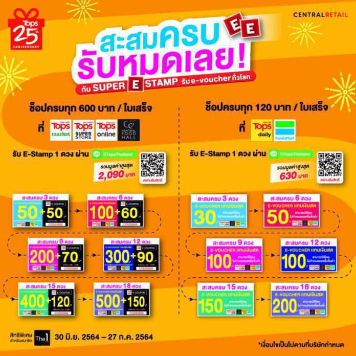 ช้อปครบทุก 600 บาท ขึ้นไป/ใบเสร็จ รับ E-STAMP 1 ดวง ที่ ท็อปส์ มาร์เก็ต, ท็อปส์ ซูเปอร์ สโตร์, เซ็นทรัล ฟู้ด ฮอลล์ทุกสาขา และท็อปส์ ออนไลน์ แลกรับ E-VOUCHER แทนเงินสด และ E-COUPON รวมมูลค่าสูงสุด 090 บาท