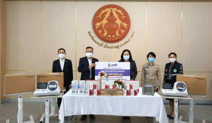 เมื่อเร็วๆ นี้ – นายวุฒิกร สติฐิต รองกรรมการผู้จัดการใหญ่หน่วยธุรกิจก๊าซธรรมชาติ บริษัท ปตท. จำกัด (มหาชน) (ที่ 2 จากซ้าย) มอบอุปกรณ์ทางการแพทย์ให้แก่ศูนย์ฉีดวัคซีนป้องกันโควิด-19 ไทรน้อย จ.นนทบุรี เดินหน้าตาม โครงการ “ลมหายใจเดียวกัน” โดยได้รับเกียรติจาก นางนิศากร วิศิษฏ์สรอรรถ รองผู้ว่าราชการจังหวัดนนทบุรี (กลาง) และ น.ส.วรรณี วุฒิฤทธากุล นายอำเภอไทรน้อย (ที่ 2 จากขวา) เป็นผู้รับมอบ ณ ศาลากลางจังหวัดนนทบุรี ซึ่งอุปกรณ์ทางการแพทย์ดังกล่าวประกอบด้วย เครื่องวัดความดันโลหิตแบบสอดแขน เครื่องวัดความดันโลหิตขนาดเล็ก และเครื่องฟอกอากาศโอโซน รวมมูลค่า 300,000 บาท เพื่อใช้ในการให้บริการฉีดวัคซีนแก่ประชาชนในพื้นที่ พร้อมทั้งมอบสตรอว์เบอร์รี ผลิตภัณฑ์สเปรย์แอลกอฮอล์และแฮนด์ครีมฮะรุมิกิ (Harumiki) เพื่อเป็นขวัญและกำลังใจให้แก่ทีมงานและบุคลากรทางการแพทย์ด้วย