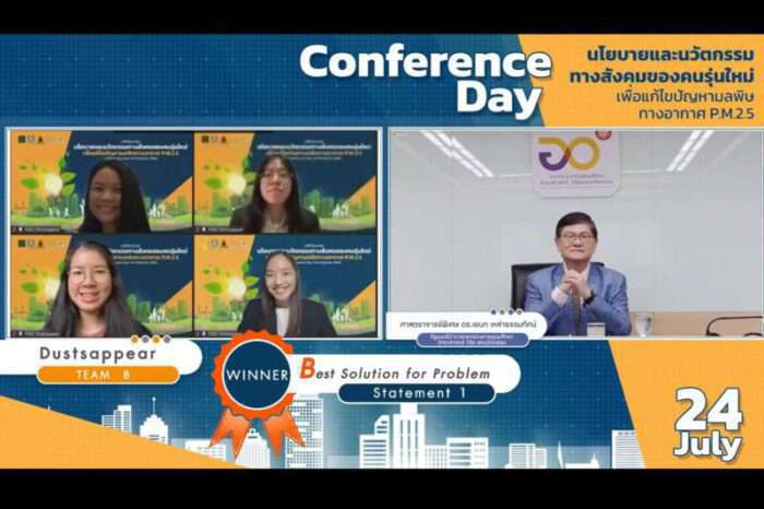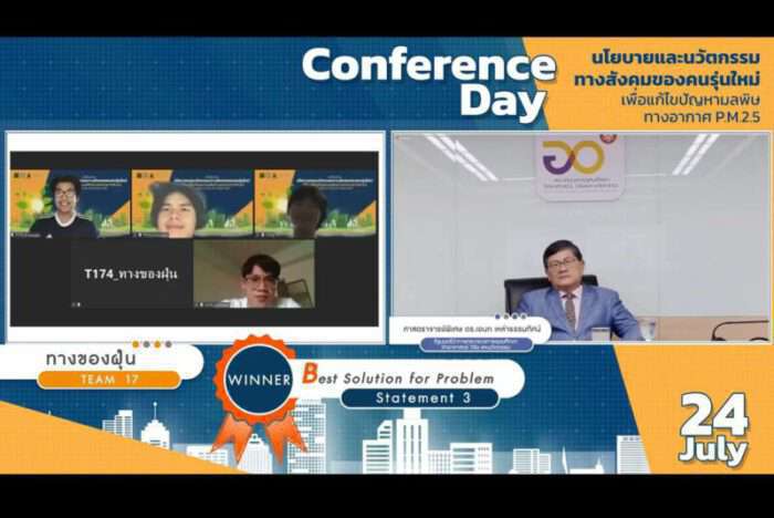 ทั้งนี้ ภายในงานยังมีการมอบรางวัลชนะเลิศ 3 รางวัล ได้แก่ 1.ทีม Dustappear ผลงานศูนย์บริหารสถานการณ์ฝุ่นละอองขนาดเล็ก (ศบฝ.) และแอปพลิเคชัน “ไทยสู้ฝุ่น” ตั้งตลาดคาร์บอนภาคบังคับ (Mandatory carbon market) และภาษี Green Area 2.ทีม Airtopia ผลงาน PM2.5 Smart Tracking จัดสรรสิทธิ (PM2.5 เครดิต) ใช้ลดภาษี 3. ทีมทางของฝุ่น ผลงาน Inclusive sustainable area development แนวทางการสร้างพื้นที่สีเขียวในชุมชนเมือง และรางวัลชมเชย 26 รางวัล